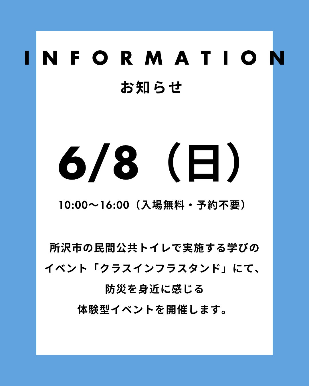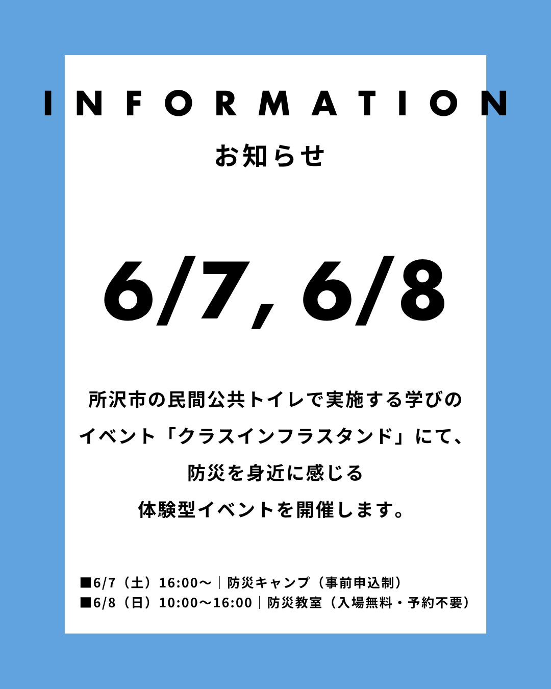 2025年6月7日(土)〜8日(日)、所沢市の民間運営公衆トイレ「インフラスタンド」にて、“災害時にも心と身体の健康を保つための知恵や工夫を、家族だけでなく、地域全体で楽しく体験する”ことをテーマにした体験型イベント【クラスインフラスタンド】防災教室を開催いたします。