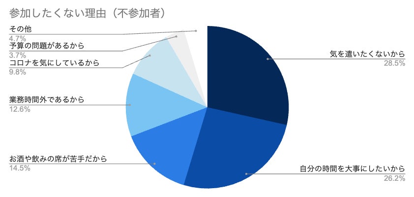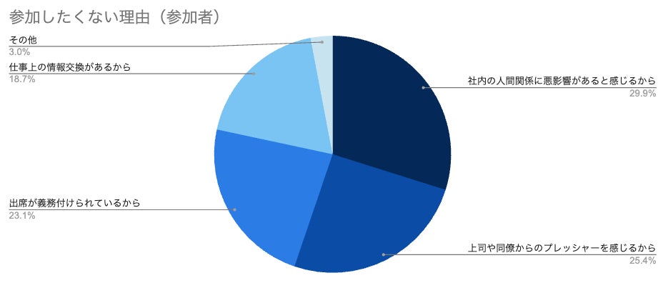 最も多い理由として「社内の人間関係に悪影響があると感じるから」と回答した人が29.9%となっており、このことから、忘年会の不参加が職場の人間関係にネガティブな影響を及ぼすと感じている人が少なくないことが伺えます。