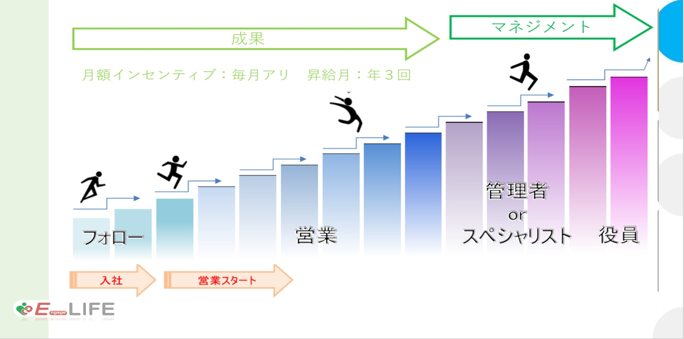 営業社員の評価規定をシステム化し数字で明確化しているのが特徴です。一般職は1等級〜22等級までのステージがあり、等級ごとに給料ステージが明確になっており自分の売上が上がれば等級もあがり給料も上がっていく仕組みになります。現場での経験を積み自信をつけその後、営業をスタート。自分の頑張った売上と成長と給料がリンクする制度がとても魅力的です。