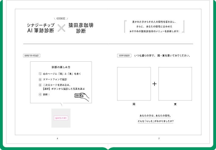 本コラボ―レーションは8月から10月の間、全国の猿田彦珈琲4店舗で約2週間ごとに実施。店舗では、「シナジーチップAI筆跡診断×コーヒー診断」と「あの人の言葉を自分の字で書いてみる展」が実施できるオリジナルコーヒーノートを配布します。