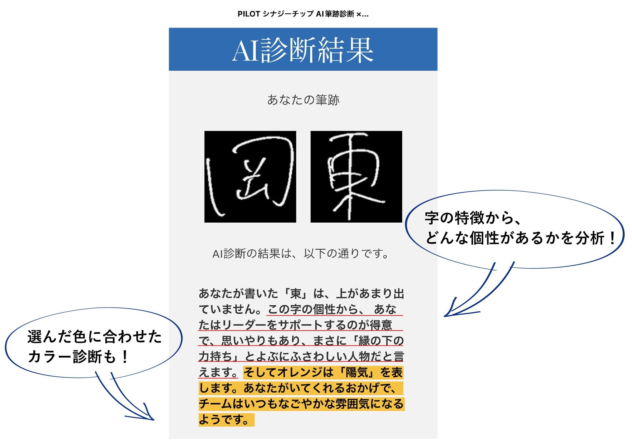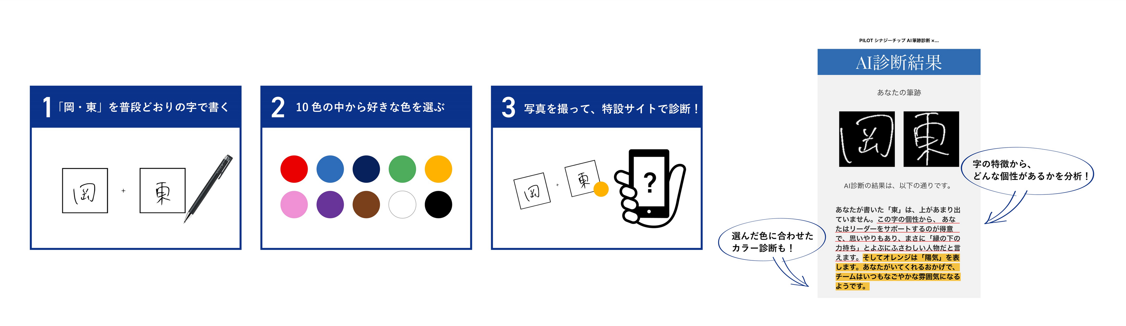 「岡」「東」の2つの文字を紙に書いて、サイト上に表示されている10色から好きな色を選び、書いた文字をスマートフォンのカメラで読み込みアップロードをすると、筆跡の特徴とカラーをもとに書き手の性格を、170を超えるパターンから診断します。