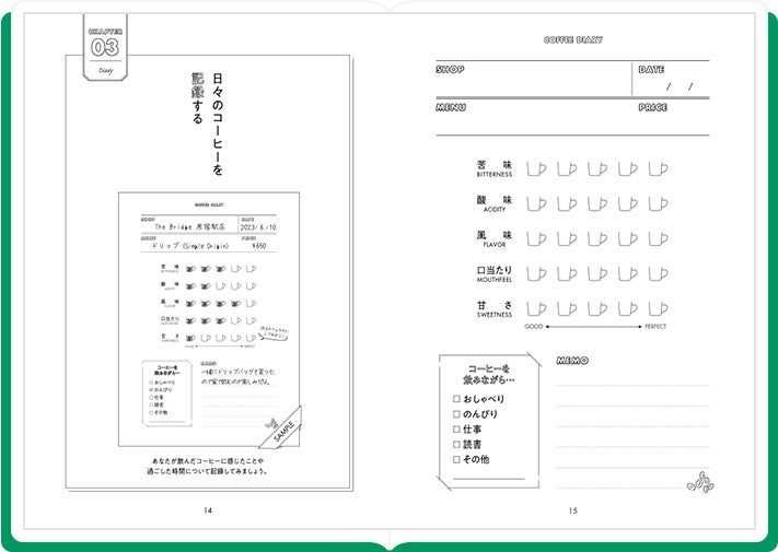 開催期間中に対象店舗にてお好きなメニューをオーダーすると、コラボ限定の「ジュースアップ(黒)」1本とコーヒーノート1冊をプレゼントします※3。ノートでは「シナジーチップAI筆跡診断×コーヒー診断」と「あの人の言葉を自分の字で書いてみる展」の体験用ページ、日々のコーヒーを記録するコーヒーログなどが楽しめます。手書きの文字とコーヒーで自分と向き合うことで、「自分らしさ」を好きになることができるノートです。