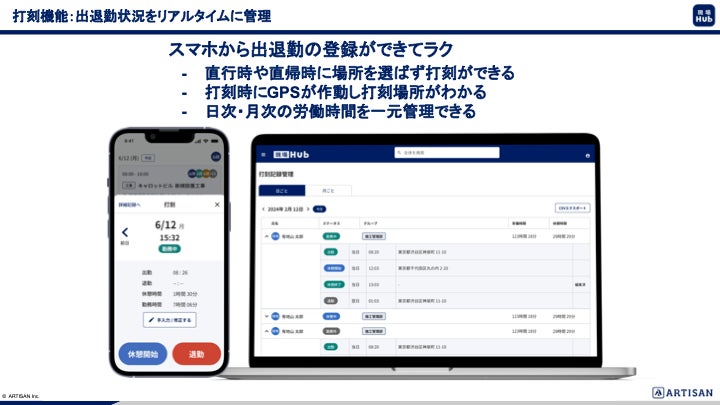工事・メンテナンス会社に特化した業務管理システム「現場Hub」を運営する株式会社ARTISAN(東京都渋谷区、代表取締役CEO:岡田光正)は、新機能「打刻機能」をリリースしたことをお知らせいたします。施工・現場業務の適正な労働時間の管理および業務効率化に貢献してまいります。