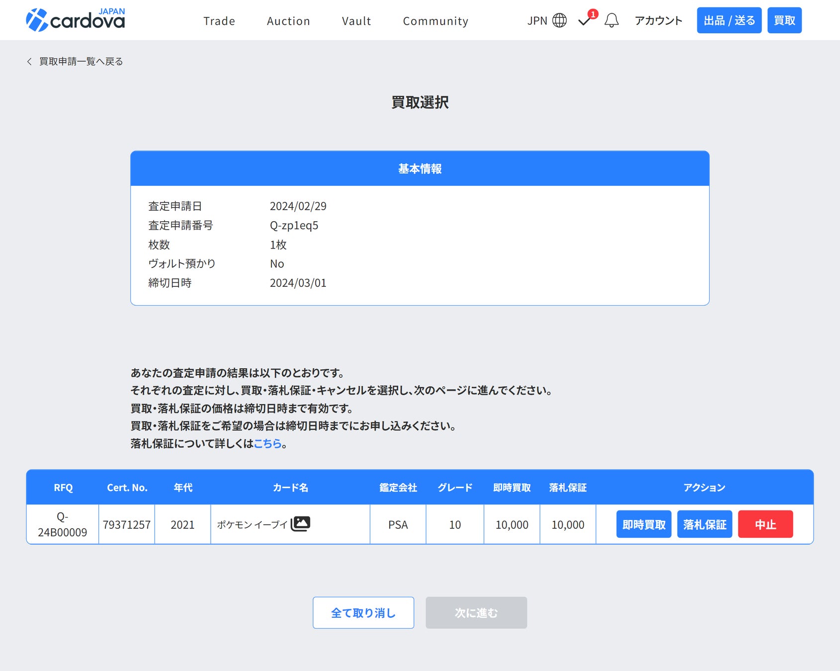 落札保証はカードがカルドバに届いてから直近で開催されるオークション、または開催期間が残り5日以上あるオークションに追加で出品されるため、最短5日後に結果が出ます。