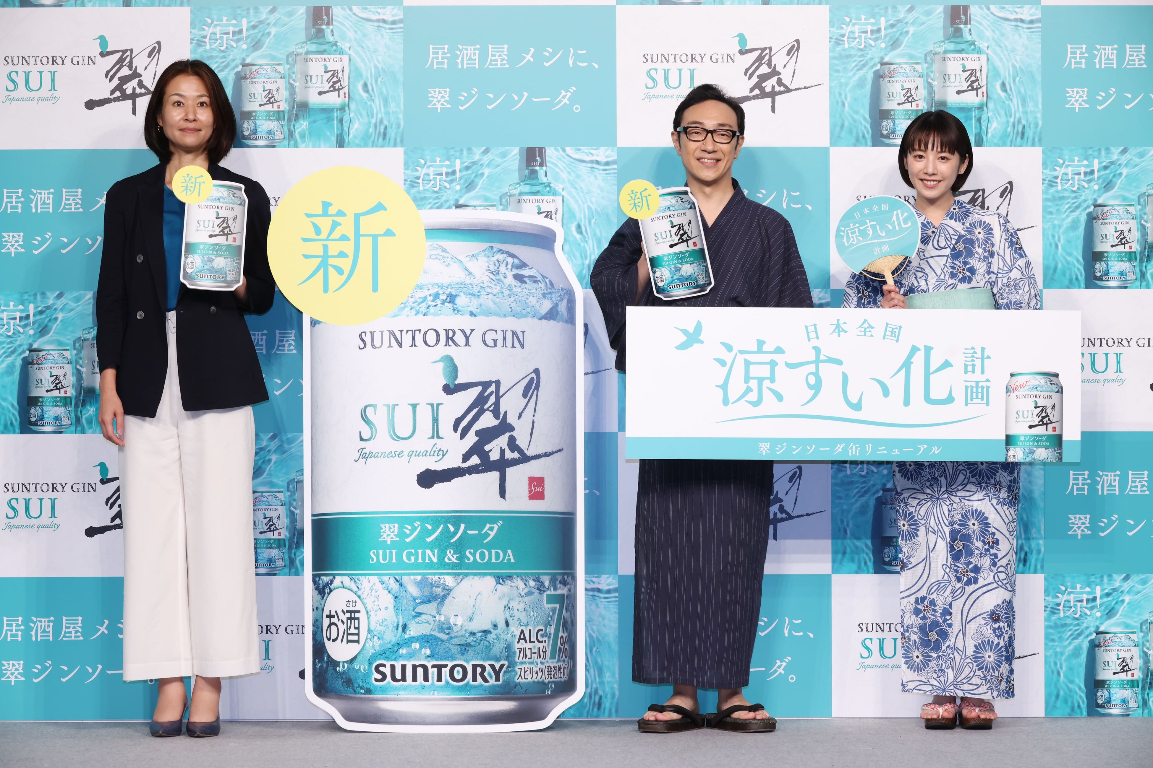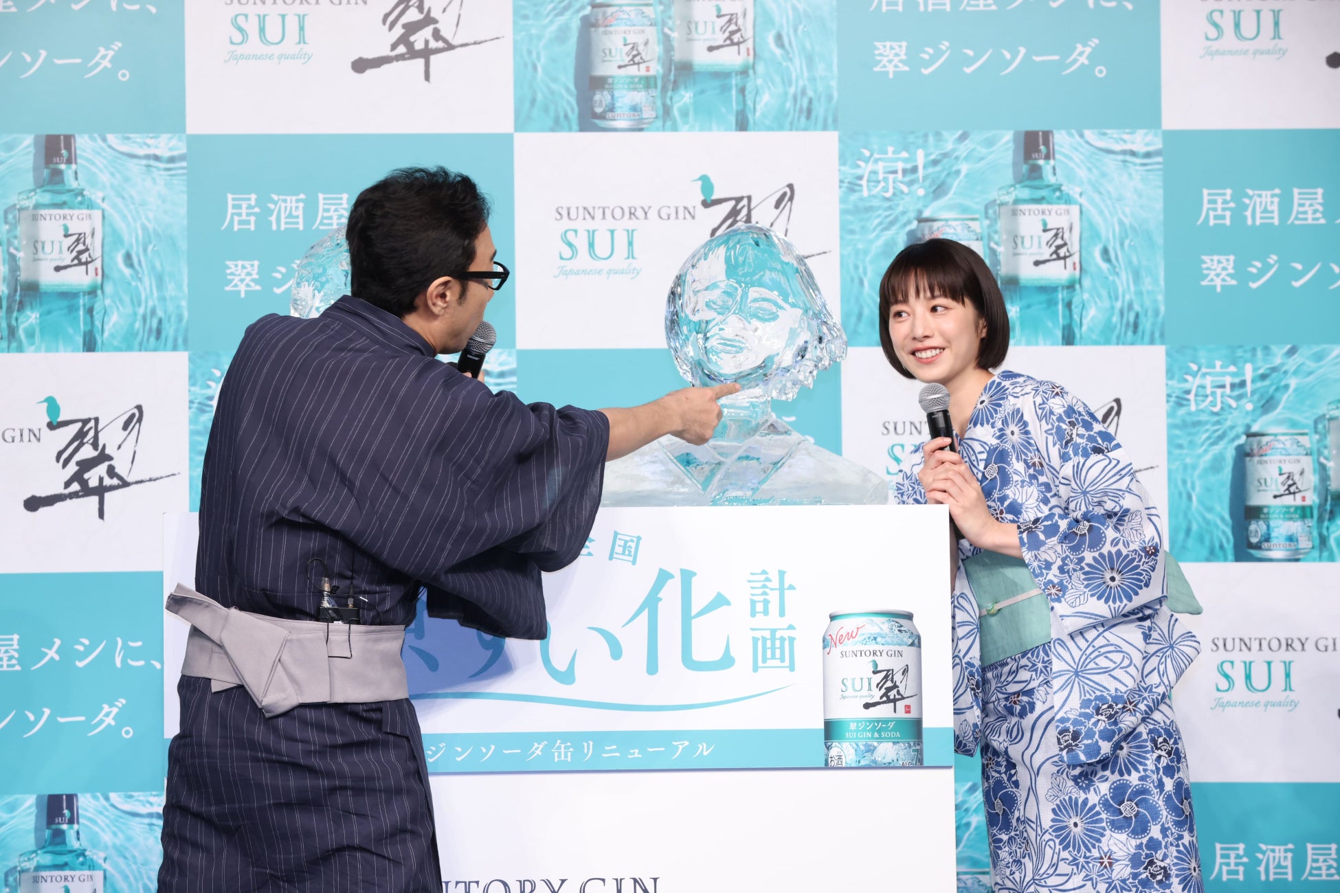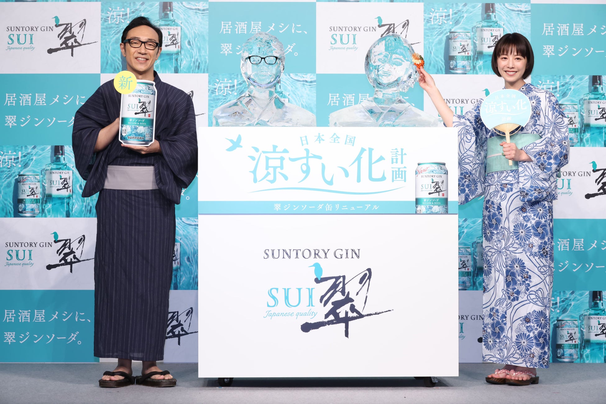 「翠ジンソーダ缶」リニューアル「サントリージン『翠』 新TV-CM発表会 およびプロジェクト発表会」開催 夏帆さん、東京03・角田さんが浴衣姿を披露!2人にそっくりな氷像も登場。