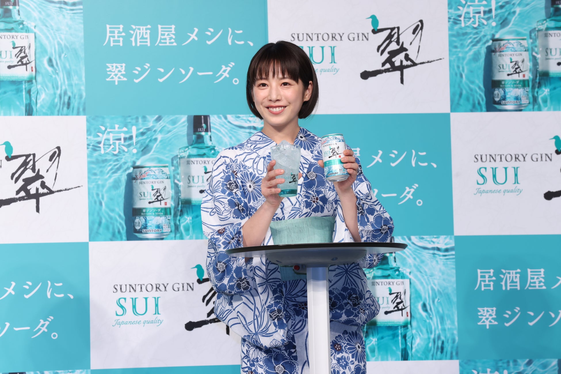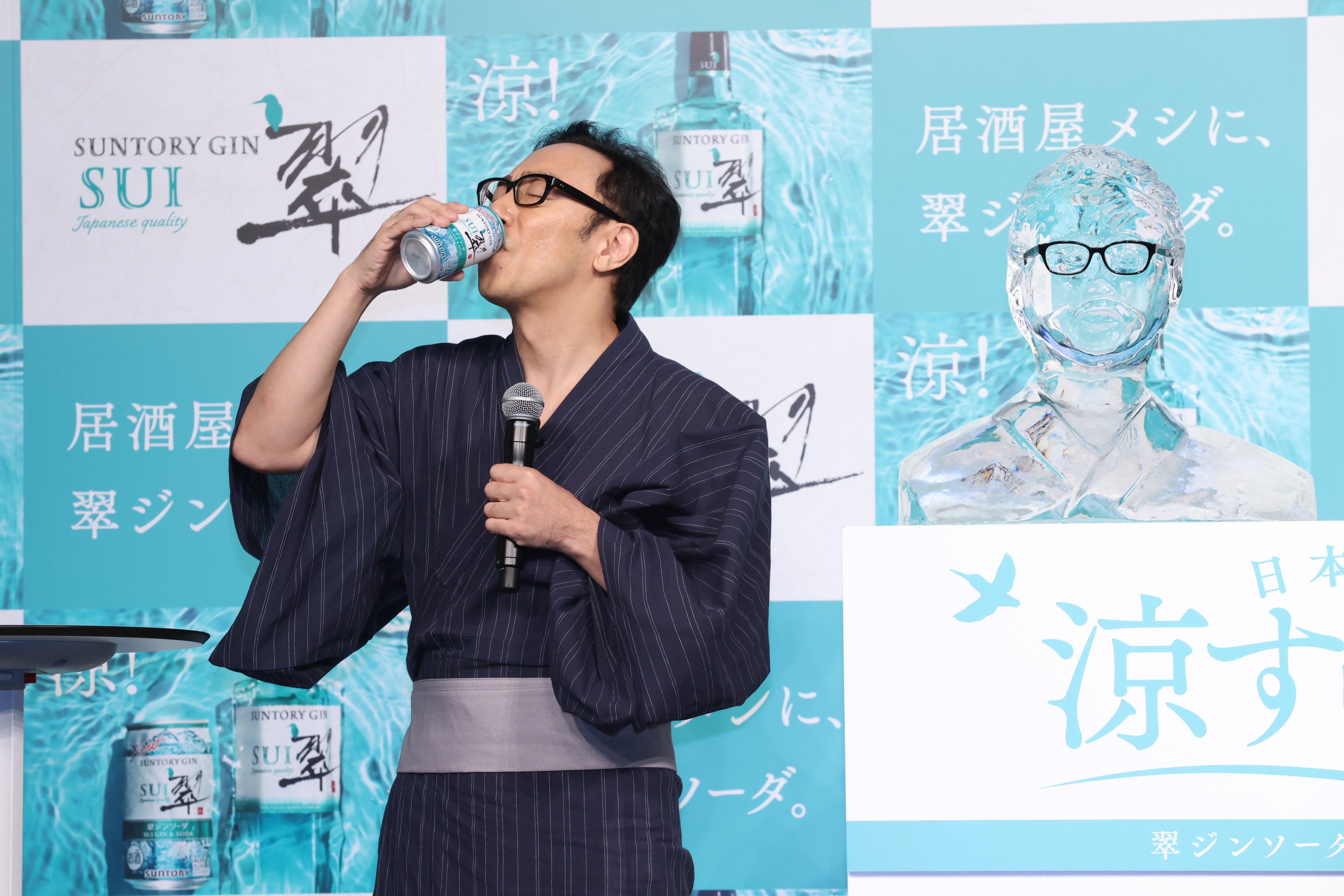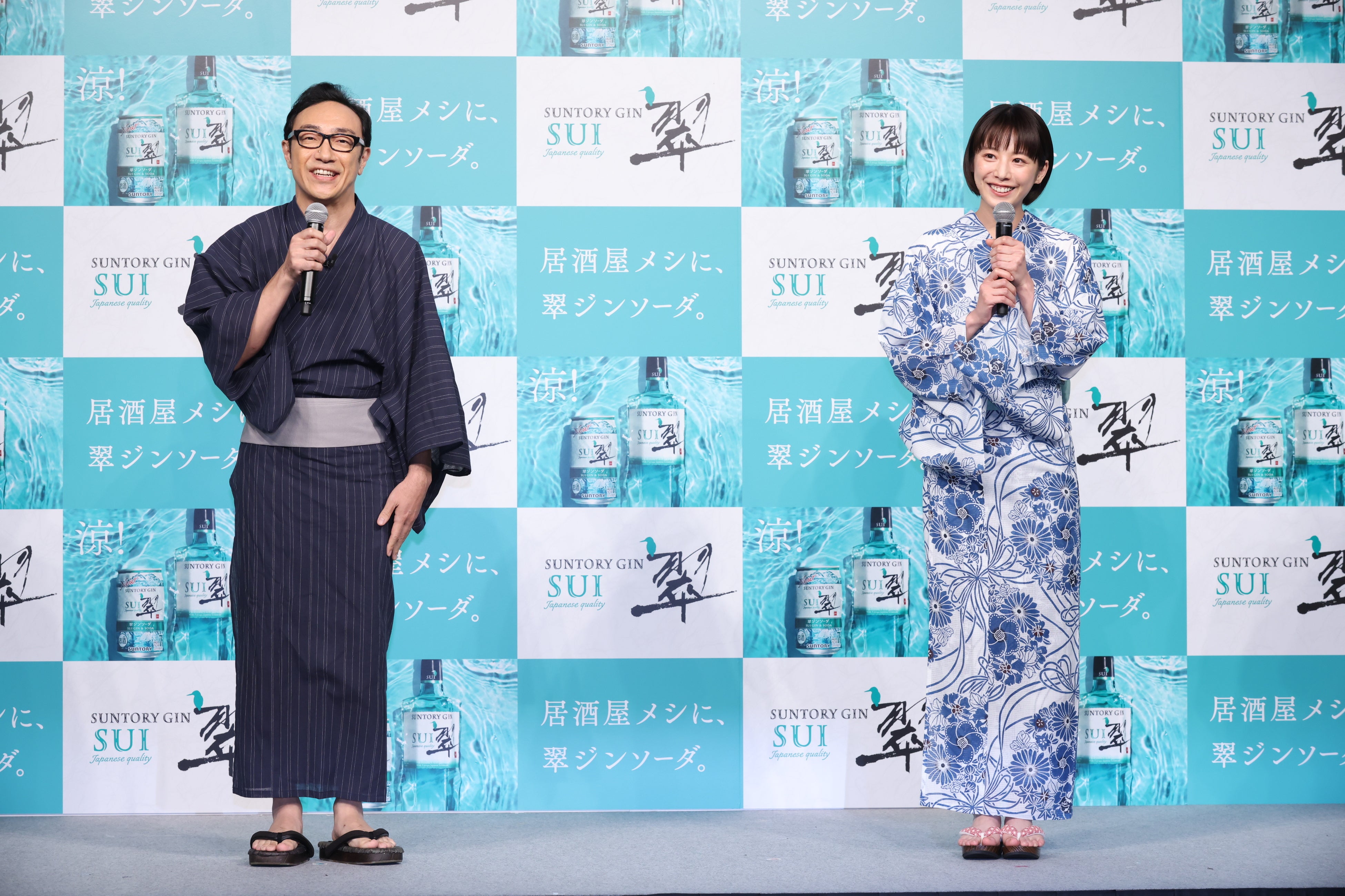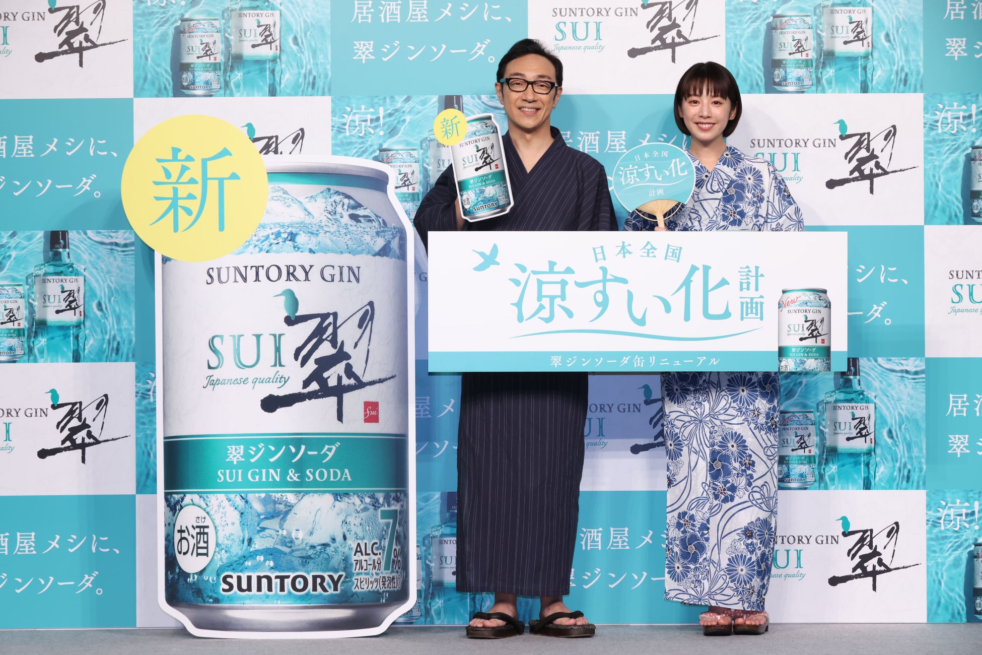 「翠ジンソーダ缶」リニューアル「サントリージン『翠』 新TV-CM発表会 およびプロジェクト発表会」開催 夏帆さん、東京03・角田さんが浴衣姿を披露!2人にそっくりな氷像も登場。