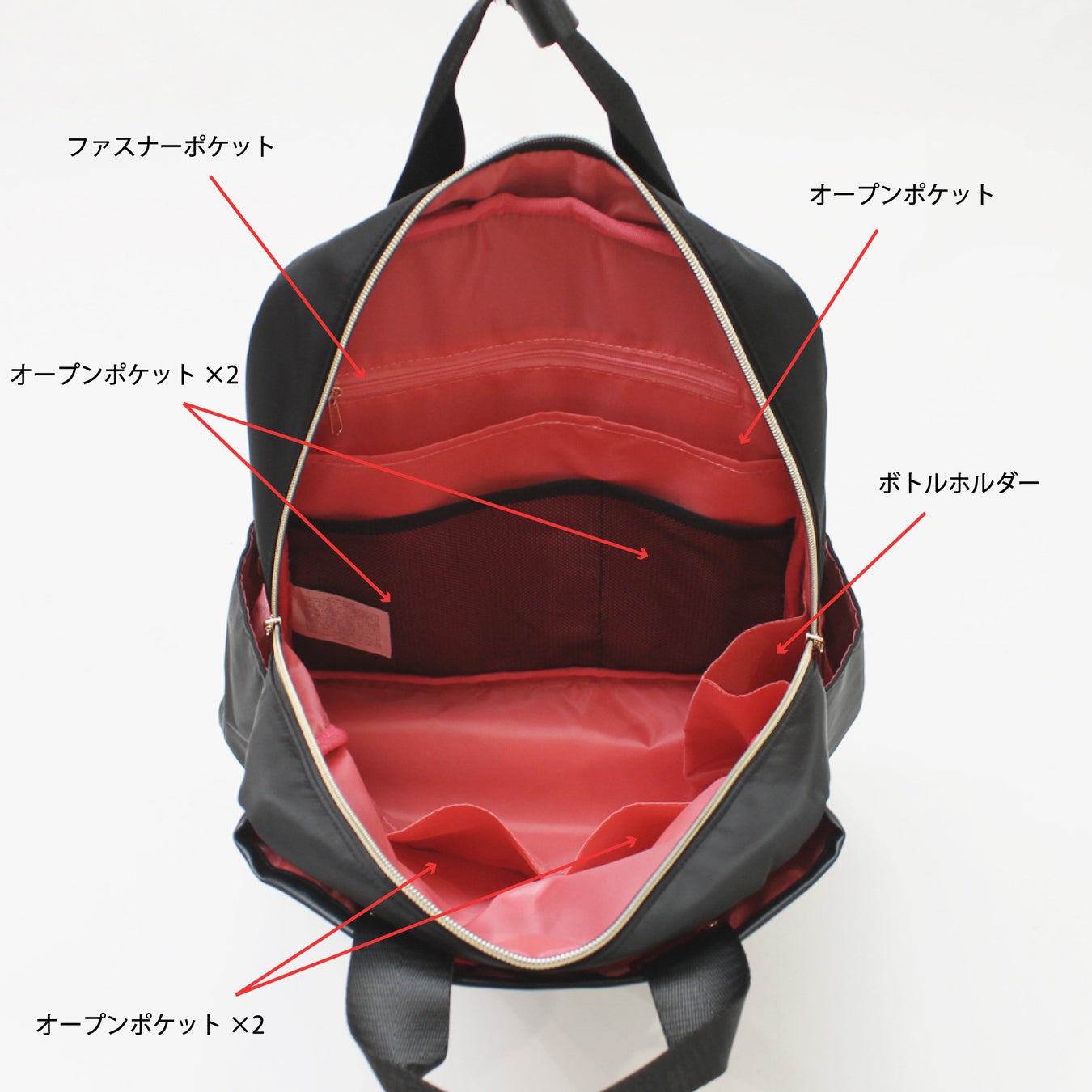 開口部はダブルファスナー仕様で大きく開き、中身の出し入れがスムーズに。
