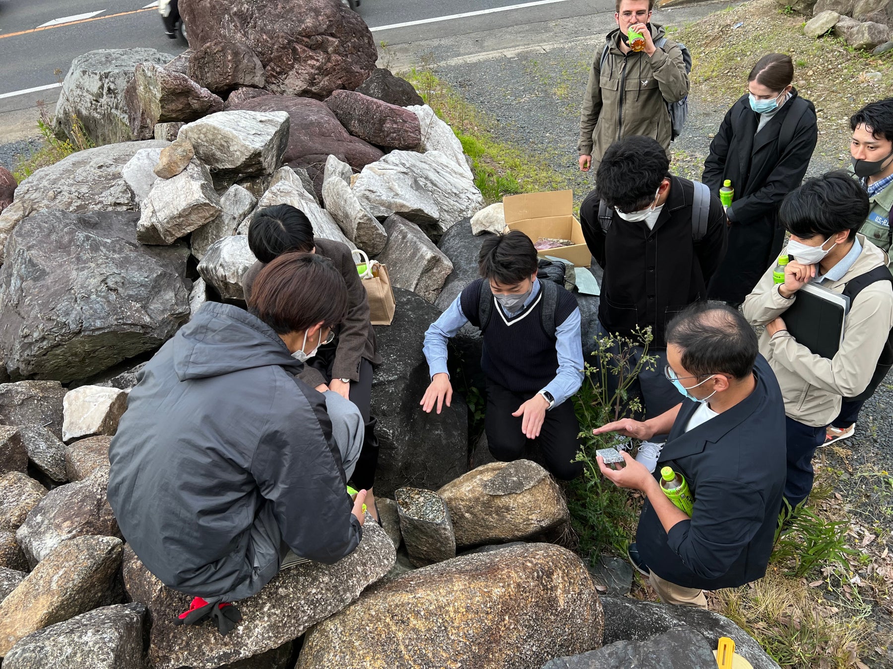 石材について学生達と現地で打ち合わせ中写真