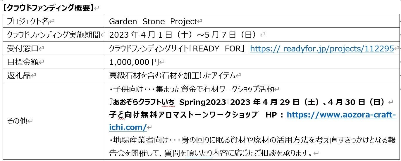 株式会社 鴨志田造園建設(本社:茨城県水戸市、代表者:鴨志田隼輔)は、有限会社大塚石材とともに、バブル以降ニーズの減少している高級石材をアロマストーンなどの新製品としてアップサイクルし、地域資源の活性化を行うクラウドファンディングを5月7日まで「READY FOR」にて実施しております。