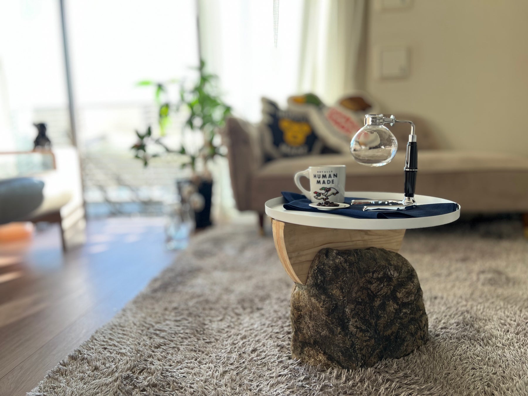 生まれる端材と小さめの庭石を組み合わせた小机です。