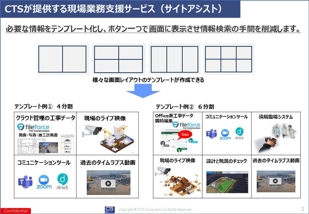 各種工事書類作成におけるオフィス系ファイルの共同編集や、現場で撮影した写真の遠隔地からの整理支援・共同作業、リアル映像と過去映像の比較による進捗管理支援などを行うことで、現場代理人・技術者の方の作業時間を短縮し負担を軽減するものです。