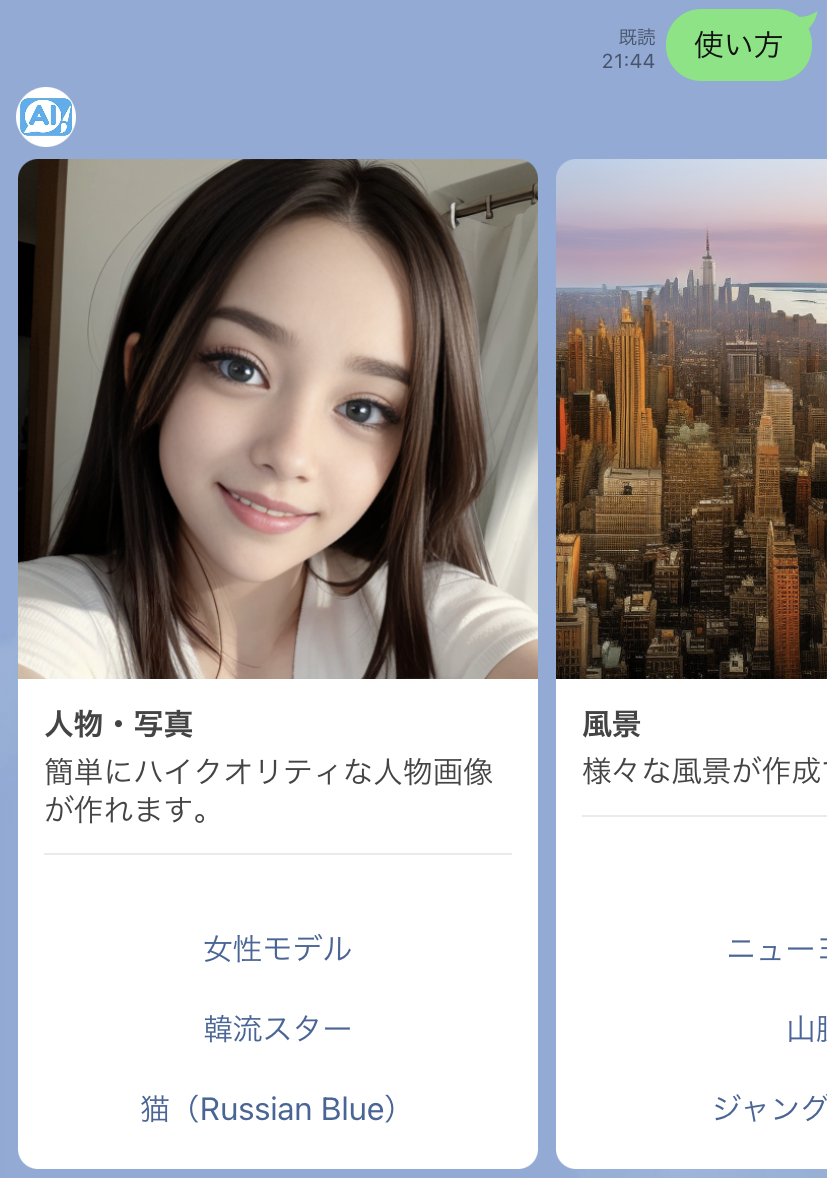 複数の画像スタイルを設定し、作成してもらいたい画像の文章をLINEで送信するだけで画像を作成してくれます。特徴は、人物などの画像のクオリティの高さと画像生成のスピードです。