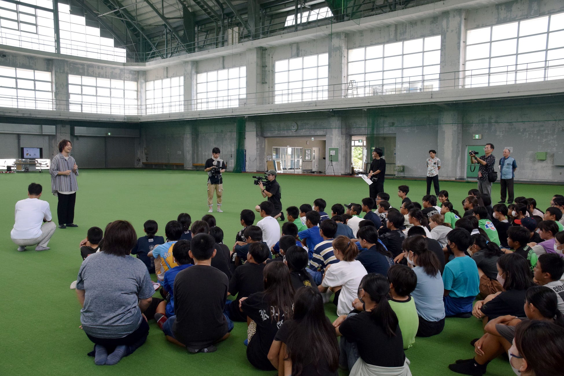 続けて、子どもたちが待っている恩納村の赤間総合運動公園へ。恩納村の4つの小学校の6年生のみなさんと一緒に、三浦さんが地上に「だ・い・ち」という巨大文字を描き、宇宙から地球を観測している「だいち2号」から撮影してもらう企画を実施しました。また最後は三浦さんが「だいち」シリーズ衛星のイメージソング「ALOS」をアカペラでサプライズ披露。子どもたちからも大きな拍手が起きました。