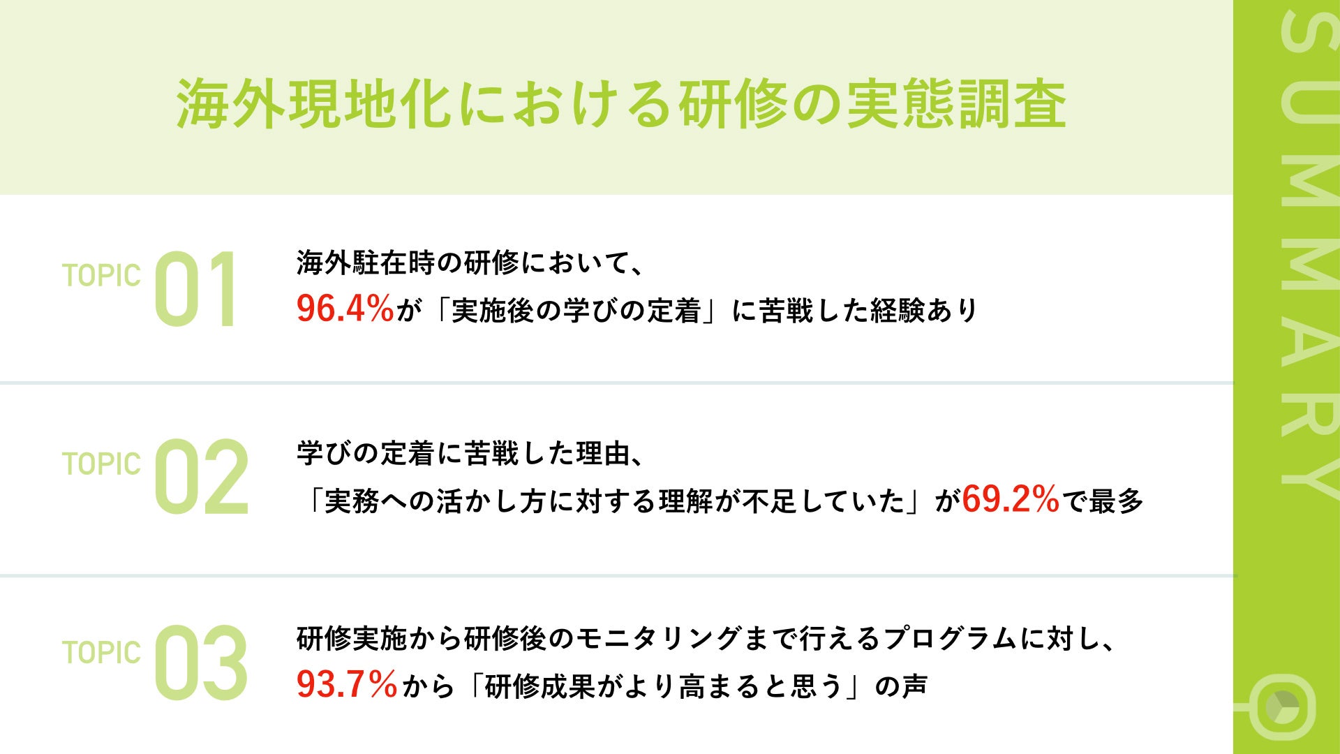 【海外現地化「研修のやりっぱなし」実態明らかに】海外人材マネジメント経験者の96.4%が「研修後」の学び定着に苦戦!「実務への活かし方に対する理解が不足」の声多数