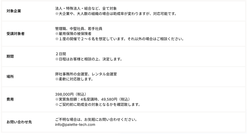 例えば、本講座を4名が同時に受講する場合、定価398,000円の受講料を、実質負担87.5%OFFの49,580円で受けることが出来ます。