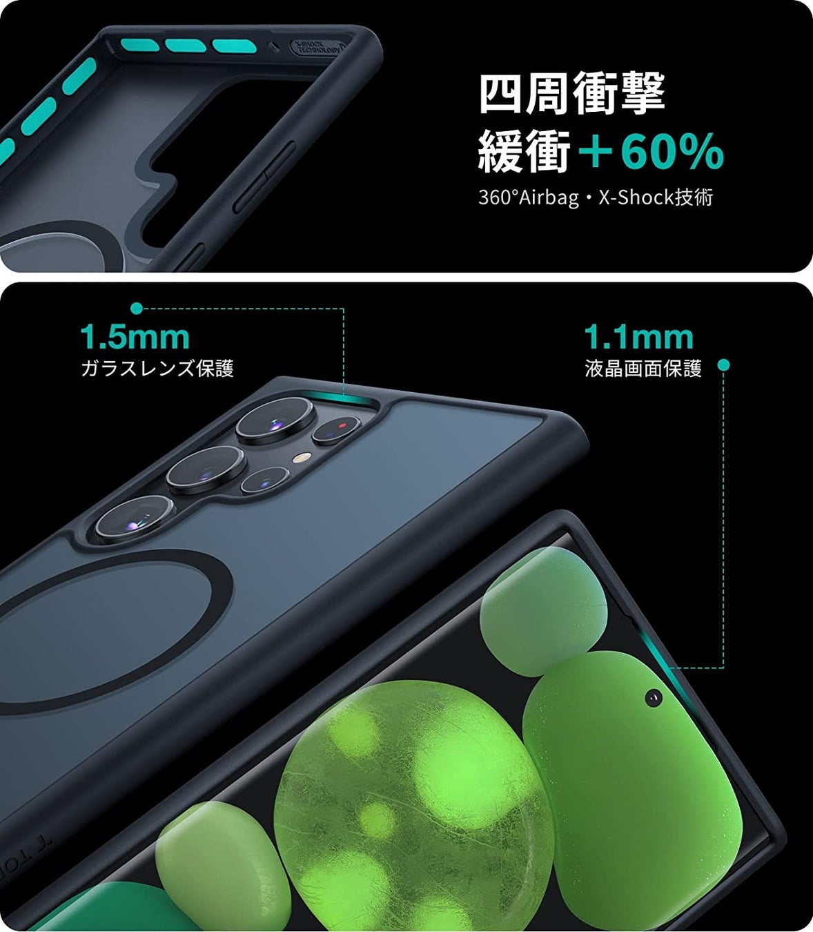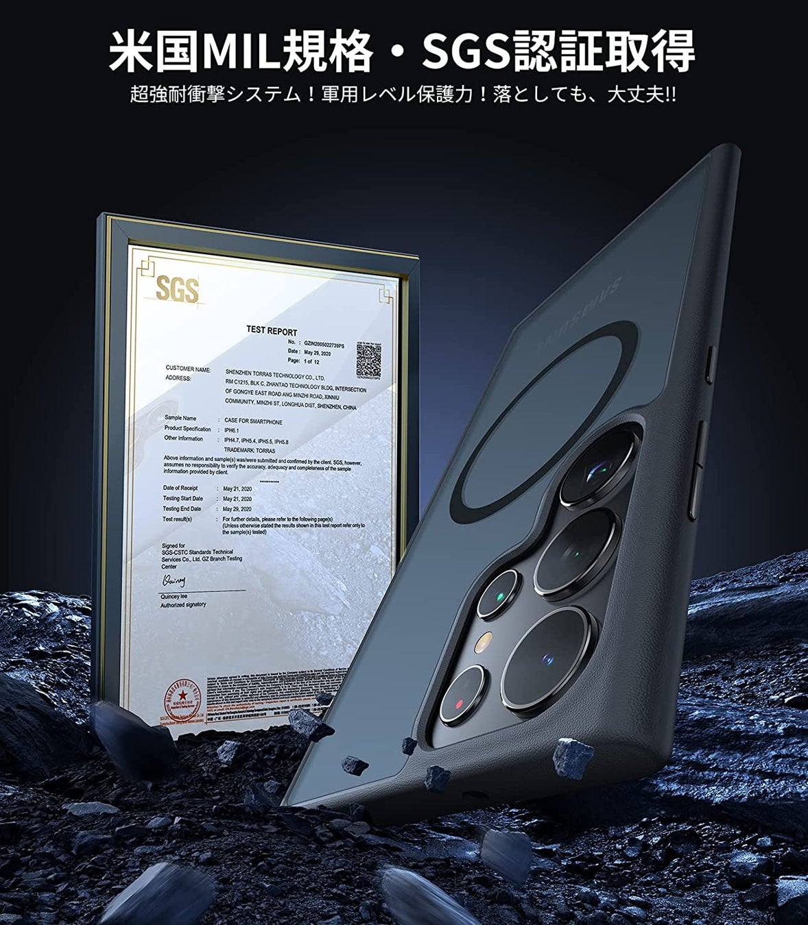 S23 Ultra ケースは世界で有名な米国国防総省の耐衝撃試験「MIL-STD-810G」をクリア。2.44mの高さから何度もそれぞれ違う角度で鉄板・コンクリートに落下させてもGalaxy S23 Ultraは完全に無傷!耐震性の高いTPUバンパーと頑丈なPC背板と組み合わせた二重構造で、バランスが良くて落下衝撃を本体に伝えにくくなります。