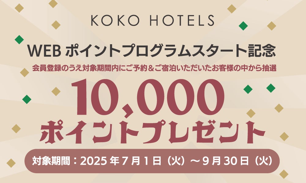 ポラリス・ホールディングス株式会社(本社:東京都千代田区、代表取締役社長:田口洋平)の子会社である株式会社フィーノホテルズ・株式会社ココホテルズが運営するKOKO HOTELおよび VALUE THE HOTELは、2025年7月1日(火)より、WEBポイントプログラムを始動いたします。公式サイトのWEB予約で貯まったポイントは、グループホテルのHOTEL WINGおよびTENZA HOTELでも使用可能となっております。