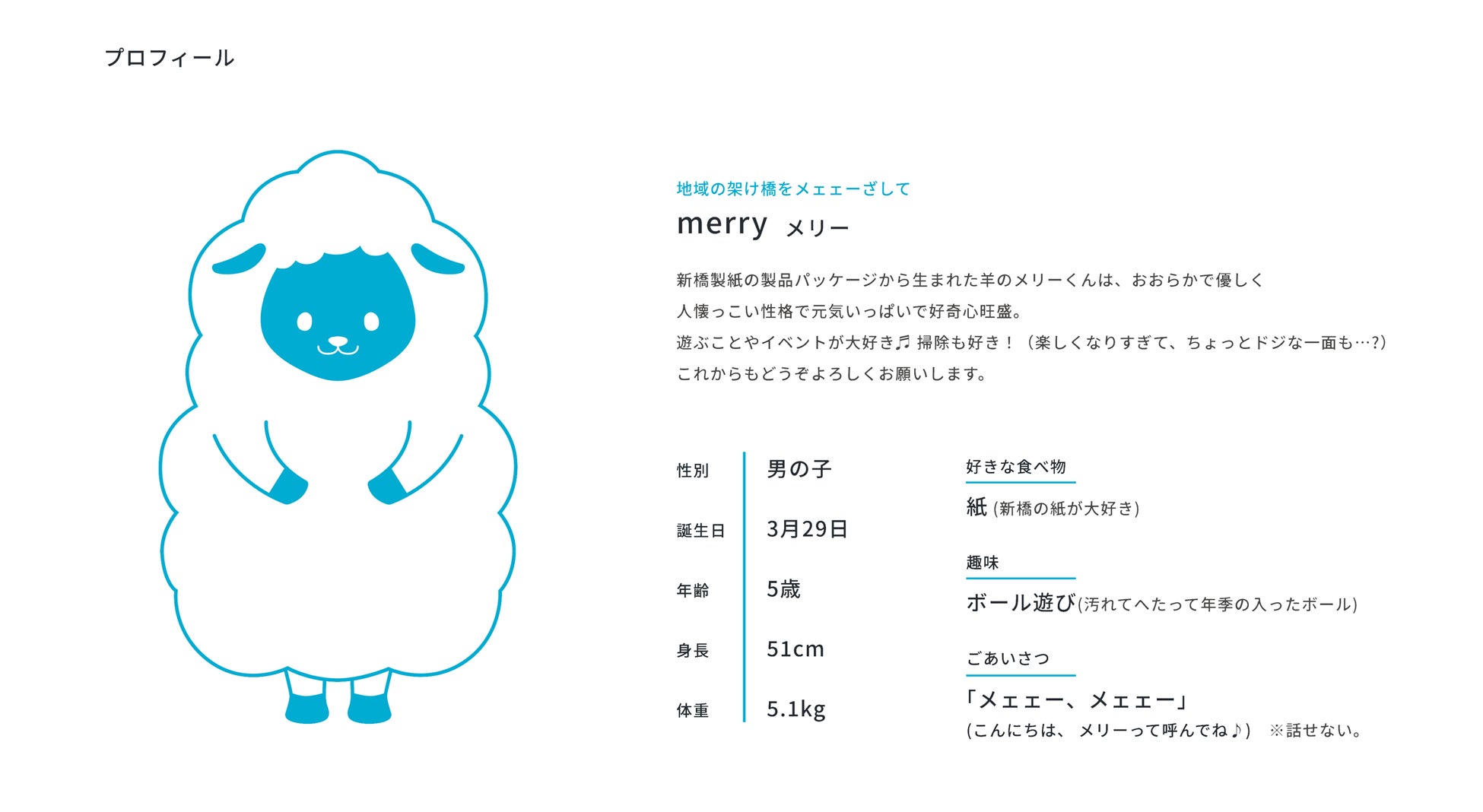 英語のmerryには「陽気な」という意味があり、「メリーさんのヒツジ」も広く知られていることから、キャラクターはかわいいヒツジに決めました。白くて清潔感があり、モコモコして柔らかいヒツジが、新橋製紙の商品イメージと重なりました。