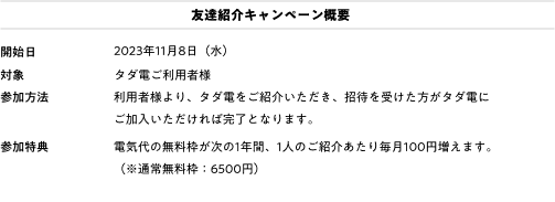 毎月の電気代が6,500円タダになる電力会社『タダ電』~毎月の電気の無料枠がさらに100円ずつ増える、友達紹介キャンペーンを開始!~