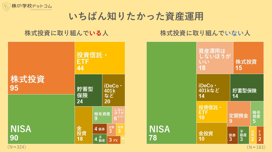 このうち「いちばん知りたかった」ことに選ばれたのは、株式投資に取り組んでいる人では95人(29.3%)が回答した「株式投資」が第1位。「NISA」は90人(27.8%)で、「投資信託・ETF」は44人(13.6%)でした。株式投資に取り組んでいない人でも、83人(42.6%)が選んだ「NISA」が断トツのトップとなっています。
