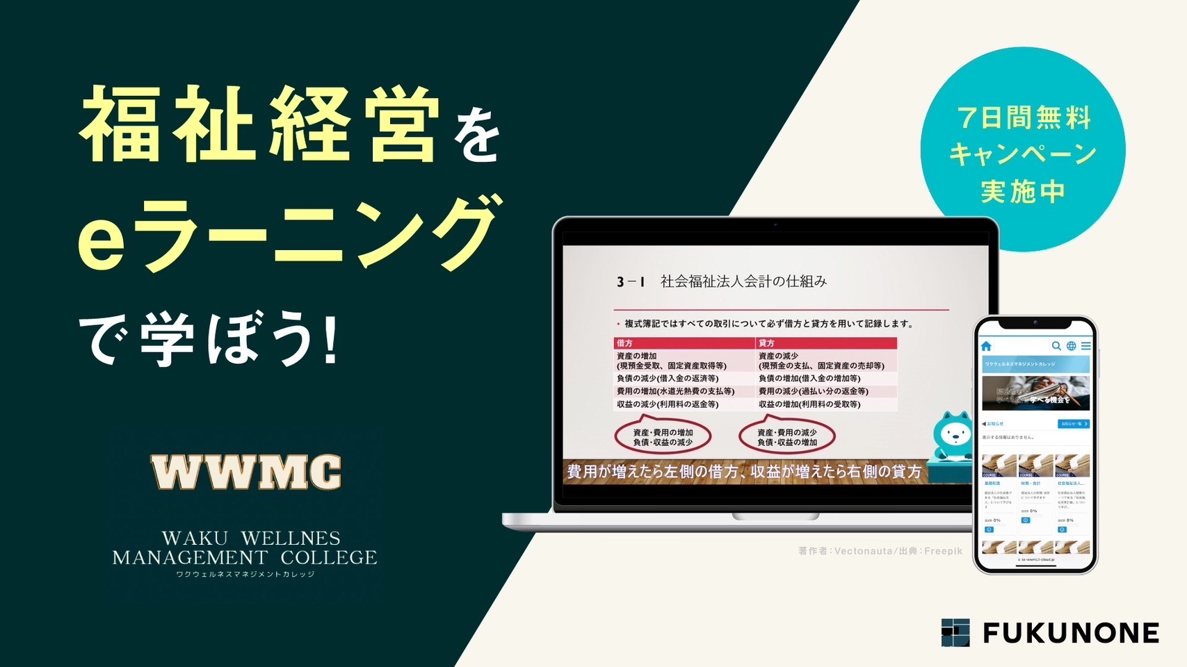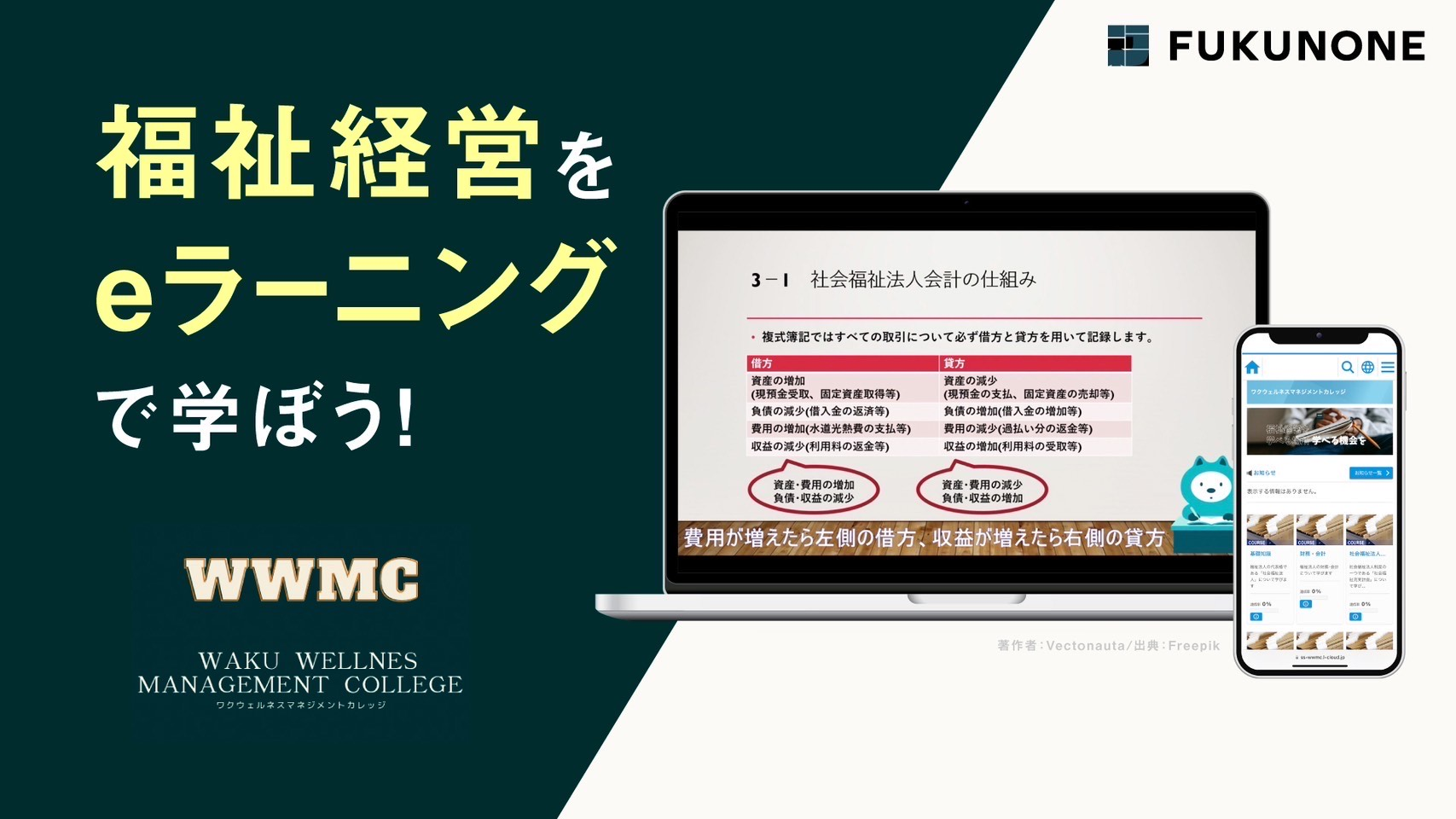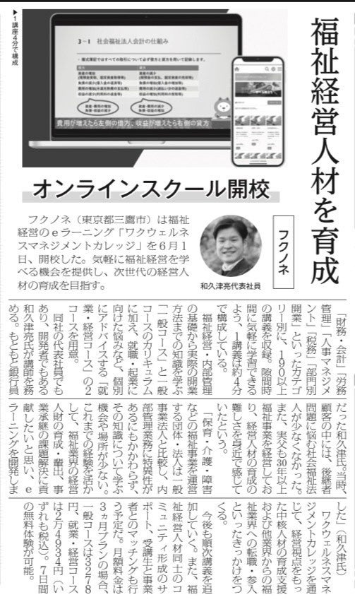 事業内容 :- 福祉経営eラーニング「ワクウェルネスマネジメントカレッジ」(https://wwmc.fukunone.org/)の運営