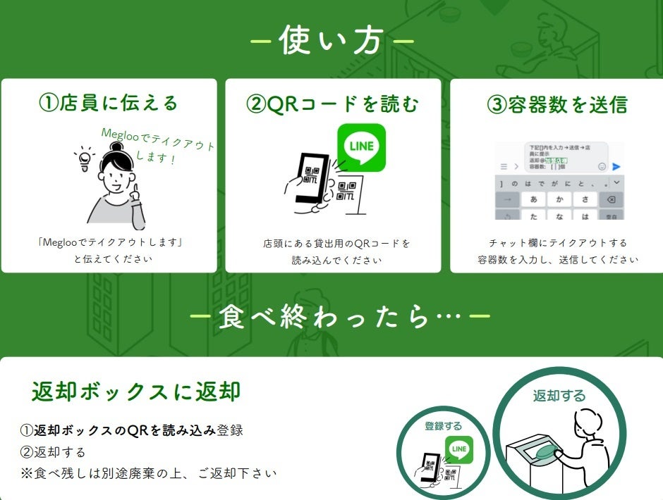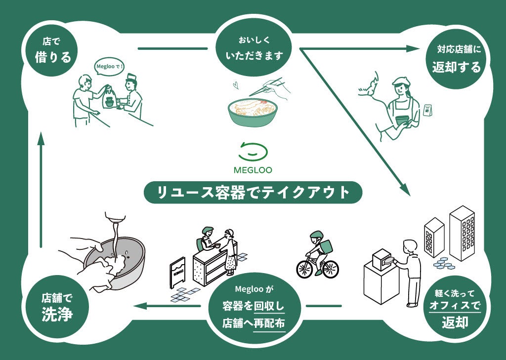 Megloo(メグルー)とは 「テイクアウトでゴミを出すのは、おしまい。」 Meglooは地域共通のリユース容器をシェアすることで、テイクアウト時の使い捨て容器を削減します。テイクアウト容器のゴミを削減すると共に、飲食店側にとってもリユース容器を店舗間でシェアすることで、テイクアウト容器のコスト削減にも繋がります。 Meglooという名前には、「容器が巡る」という意味と、「ごちそうさま」「ありがとう」という感謝の気持ちも地域でめぐるという思いが込められています。 2020年10月に鎌倉で開始し、全国20都市で実装、スポーツイベントやフェスなどにも利用が広がる。