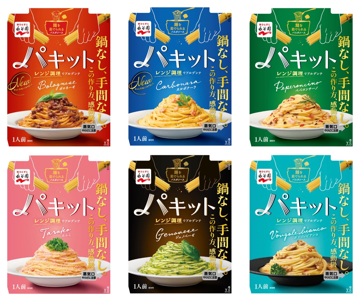 株式会社永谷園が開発した商品「パキット」は、パキッと折ったパスタを電子レンジ(以下、レンジ)でチンするだけで、“パスタの茹で”と“ソースの温め”が一度にできる便利なパスタソースとなっています。鍋いらずで調理に手間がかからない点に加え、これまでにない調理方法によって実現した“茹でたてのアルデンテ食感”も楽しめます。「パキット」シリーズとして全6種類を展開しています。