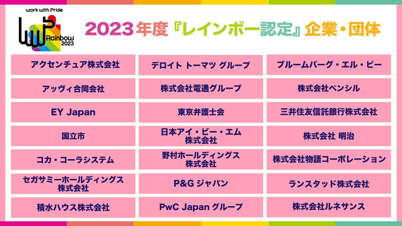 (アクセンチュア株式会社、アッヴィ合同会社、EY Japan、国立市、セガサミーホールディングス株式会社、積水ハウス 株式会社、デロイト トーマツ グループ、株式会社電通グループ、東京弁護士会、日本アイ・ビー・エム株式会社、コカ・コーラシステム、野村ホールディングス、P&Gジャパン、PwC Japanグループ、ブルームバーグ・エル・ピー、株式会社ペンシル、三井住友信託銀行、株式会社 明治、株式会社物語コーポレーション、ランスタッド株式会社、株式会社ルネサンス)