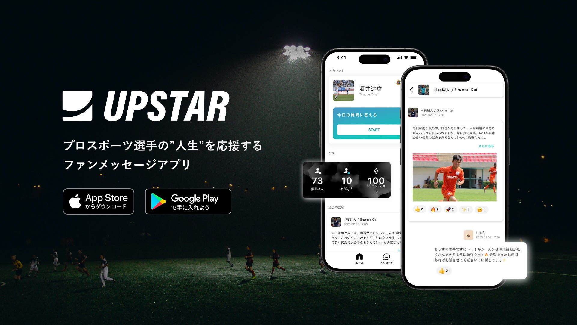 「UPSTAR」は、プロスポーツ選手の“人生”に寄り添い、試合の勝敗だけでなく、日々の挑戦や葛藤をファンに届けるファンメッセージアプリです。選手のリアルな声が日常的に届く、新しい応援体験を提供しています。