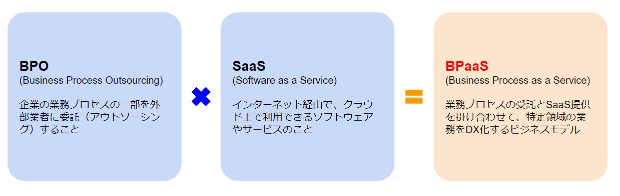BPaaSとは、BPOとSaaSを掛け合わせてBPOを進めるビジネスモデルのことで、特定の業務プロセスに関するBPO支援だけでなく、SaaSによる業務効率化も掛け合わせて、業務プロセスを包括的にDX化する取り組みのことを指しています。