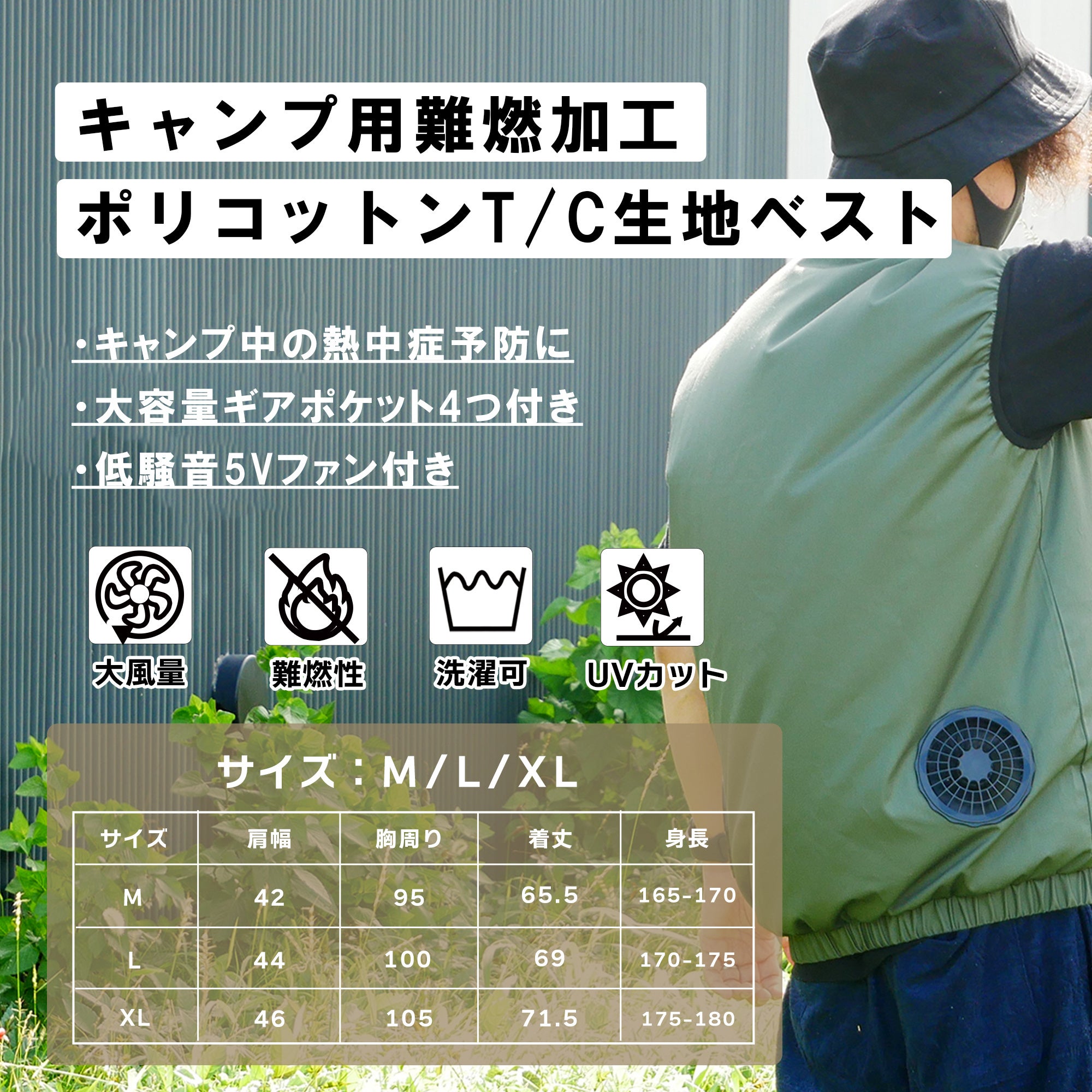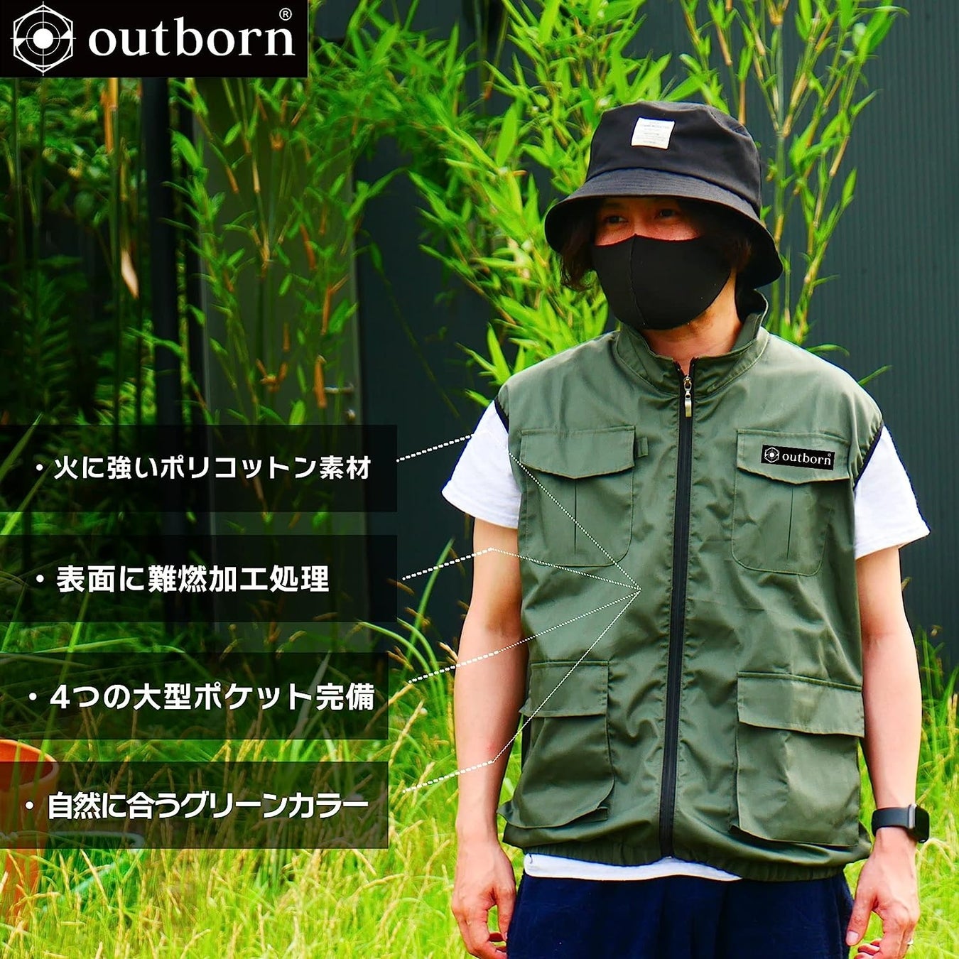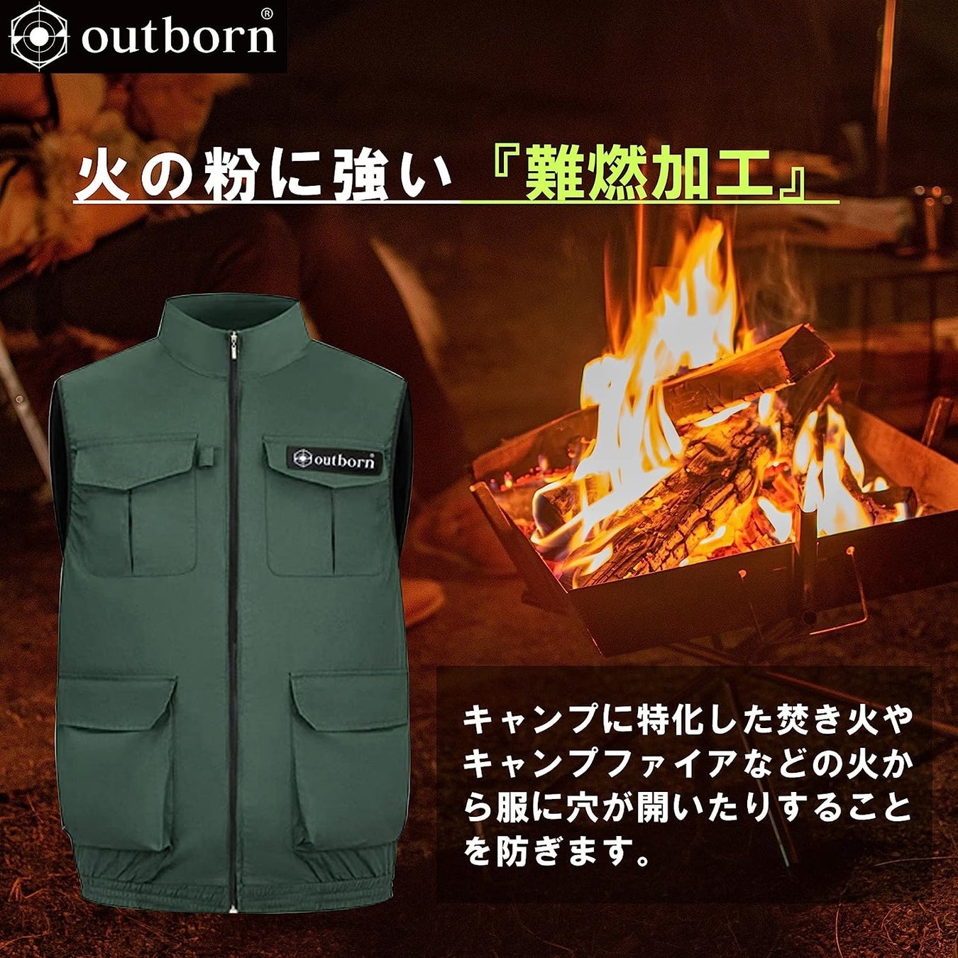 キャンプ中の熱中症対策に!火の粉に強い難燃ポリコットン素材のアウトドア用ファン付作業服ベストが「OUTBORN」より新発売!