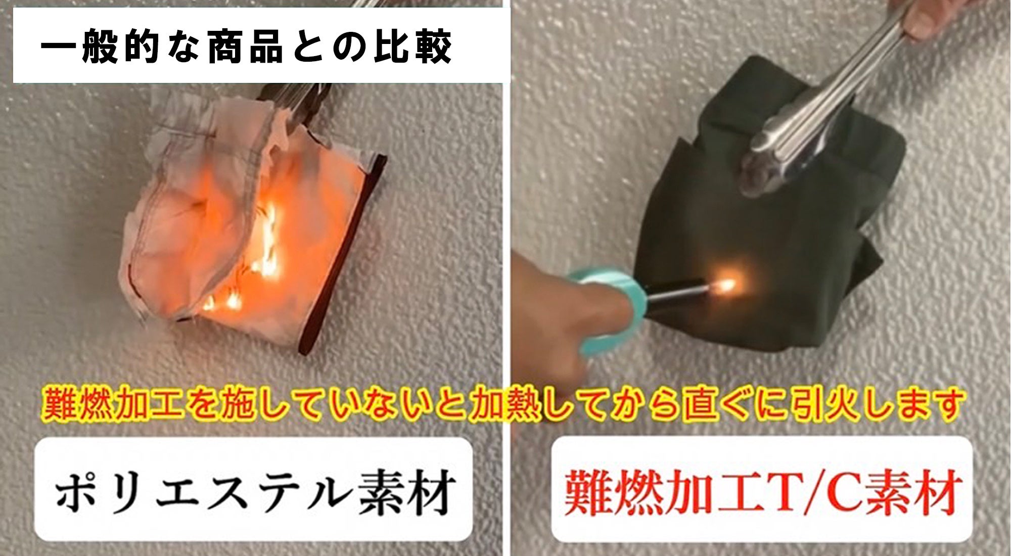 一般的なファン付作業服に使用されてるポリエステル(100%)は非常に燃えやすい素材となり、火の側での使用の際には大変注意が必要となります。