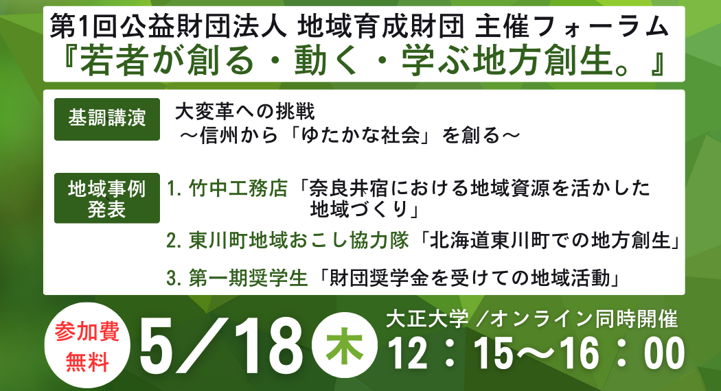 公益財団法人 地域育成財団は2021年4月に設立し、返済不要な給付型奨学金を地方で活躍を希望する次世代を担う大学生、大学院生、外国人留学生に対し給付している公益財団法人です。この度、設立3年目を迎え、地域創生に関する学業や研究に取り組む奨学生の学びの一助になればと『若者が創る・動く・学ぶ地方創生。フォーラム』を開催します。