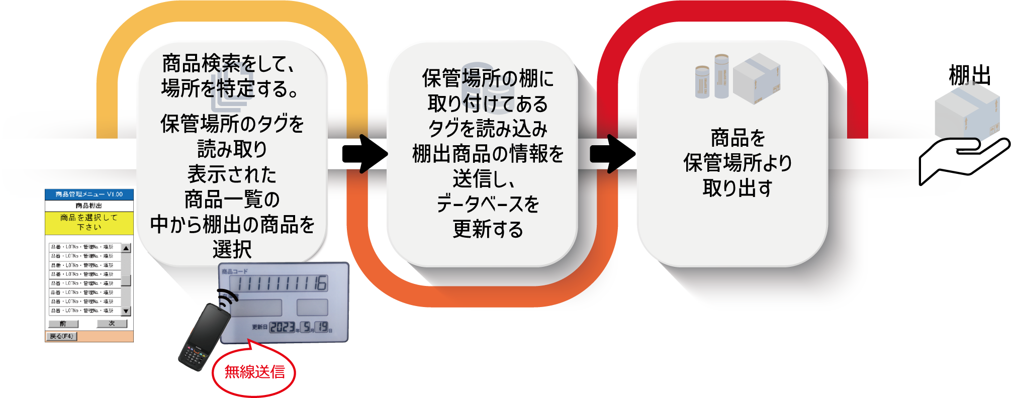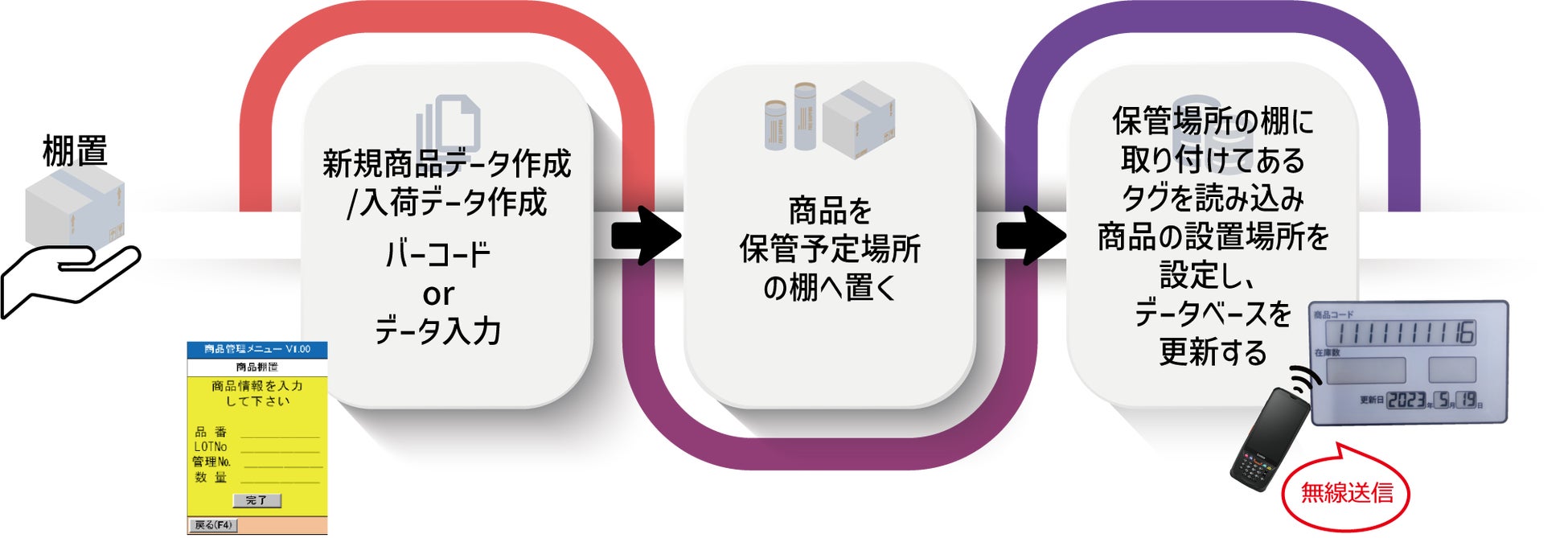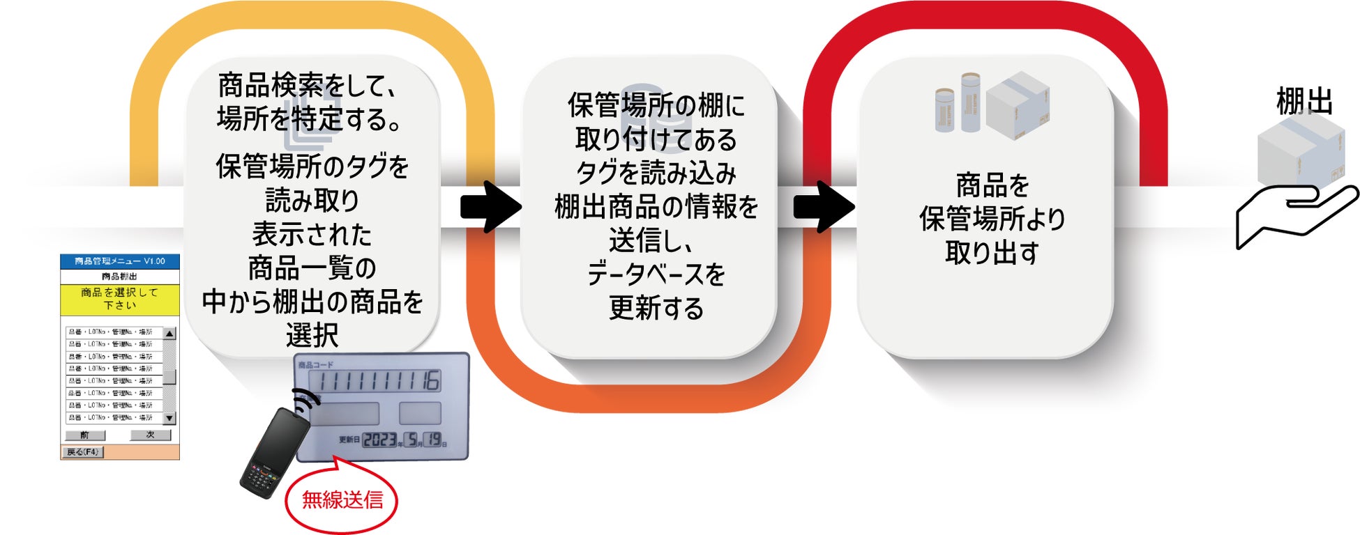 LINESYS-sho×表示機能付RFIDタグであれば「何がどこにあるのか」が簡単に検索できるため、効率的にピッキングを行うことが可能となります。