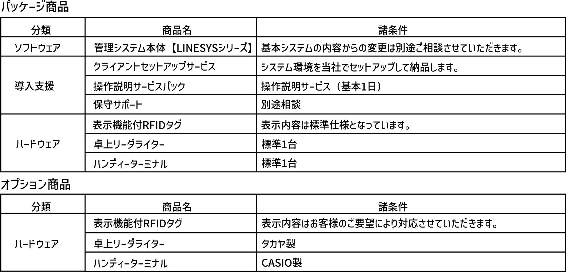 体験版セット内容:・LINESYSシリーズ システム各種 ・表示機能付RFIDタグ(10枚)・卓上リーダライター(1台)・ハンディターミナル(1台)