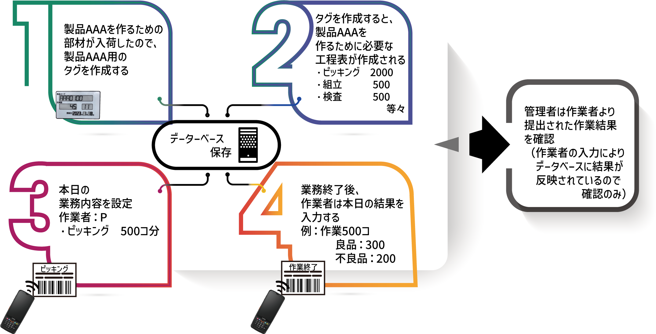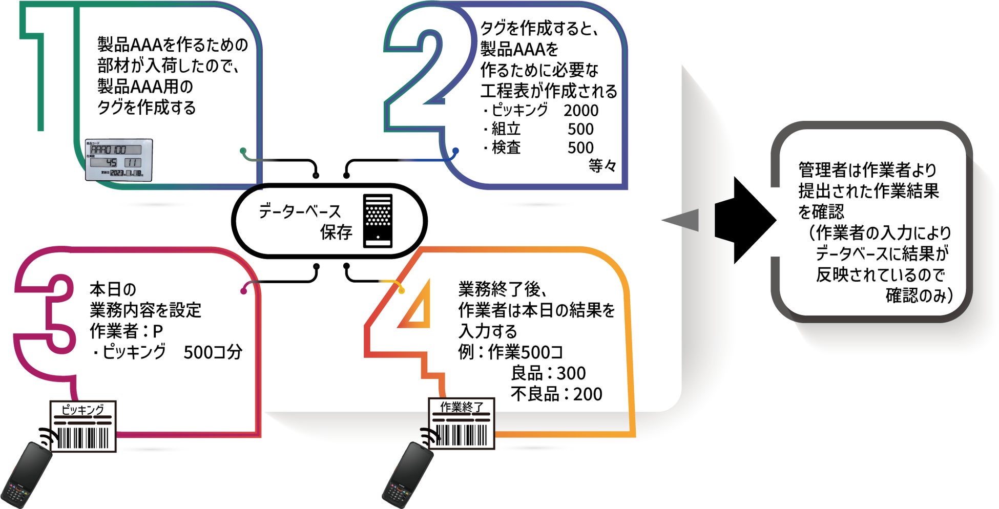 LINESYS-sak×表示機能付RFIDタグで成果を可視化し、問題を把握・管理することができるため、生産計画や生産コストを抑える仕組みを考察するための情報を提供することができます。