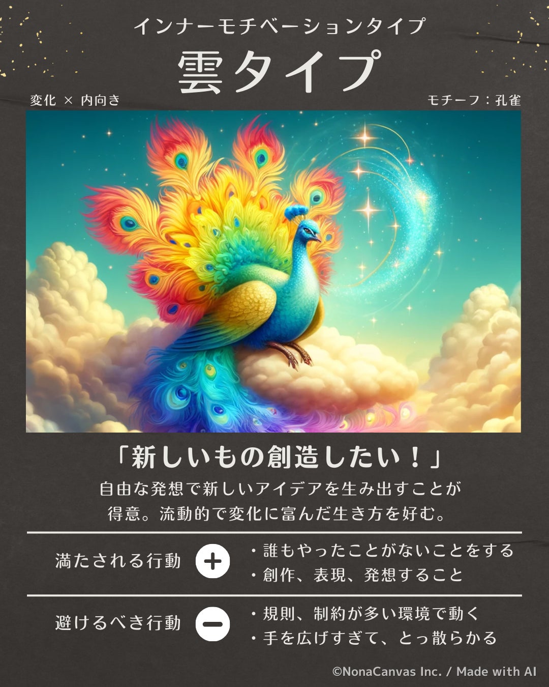 雲タイプ(モチーフ:孔雀)は「新しいこと創造したい!」という探究心が特徴。変化を求めるこのタイプは、新しいアイデアやプロジェクトに挑戦することで生き生きとします。逆に、ルーティンワークや変化のない環境ではやる気を失います。