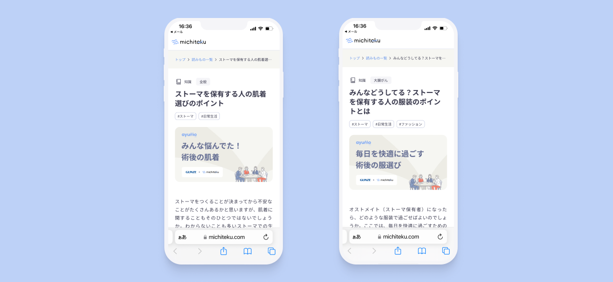 このたび、当社の新プロジェクト「ayumo」のコンセプトのもと、その最初の取り組みとして、グンゼと協業して、大腸がん患者さんのための肌着選びに関する記事コンテンツを共同制作しました。