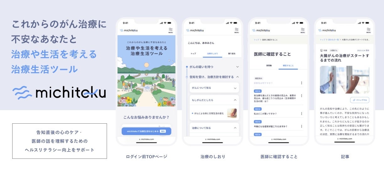 がん患者さんにとって、数多くの情報から自分に合った信頼のできる情報を探すのは難しいことです。また、多くのがん患者さんは、医師より告知を受けてから不安な気持ちを抱えながら短い時間で治療の方針を決めなければなりません。加えて、仕事やこれからの生活など治療のこと以外に考えなければならないこともたくさんあります。「michiteku」は、そのような状況下にある患者さんの不安を最小限にして治療を開始できるように、がん患者さんの治療への向き合い方や生活をサポートするツールです。