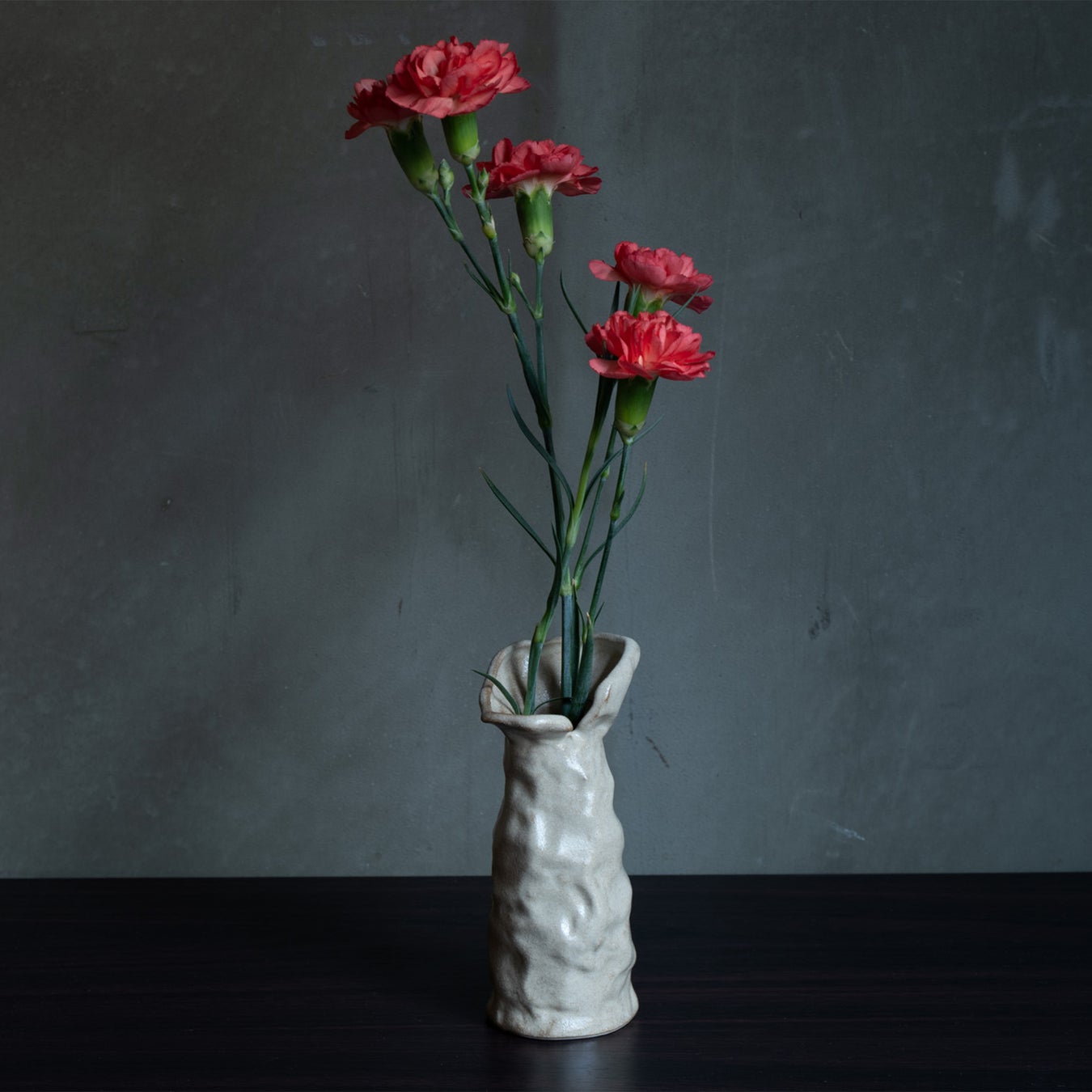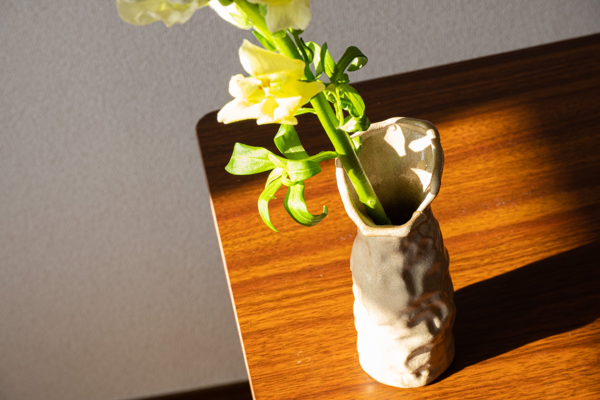 ごつごつとした歪な形状や破れたような開口部は、外的な力が不規則にかかり変形した様子をイメージしたデザインとなっており、生育環境の厳しさを表現しています。そこに花を生けることで「厳しい環境下の中でたくましく咲く花」という構図を作り出し、生命力を引き立てます。