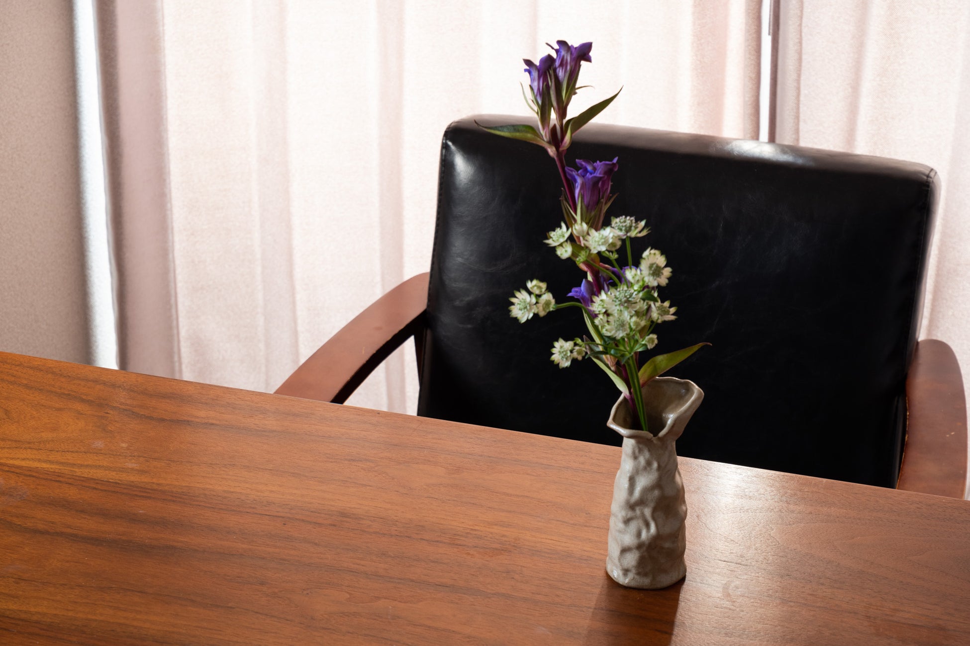その大きな岩が雨風にさらされて表面が削られていたり、欠けていたりする様子は自然界の厳しさを物語っているようです。花瓶「巌 / Iwao」は、そんな巌にしっかりと根を張りたくましく生きる小さな花の強さを伝えます。