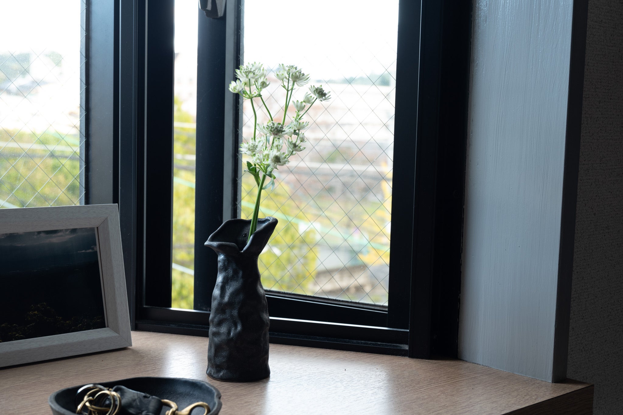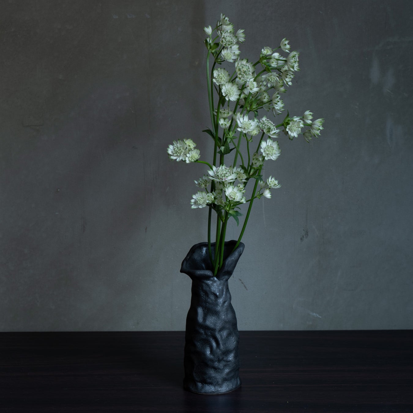 花瓶の黒は、「鉄釉(鉄黒釉)」と呼ばれる方法で発色させています。これは釉薬に含まれる酸化鉄によって呈色反応を引き起こす方法で、瀬戸焼の代表的な施釉方法の一つです。表面のざらざらとした質感と落ち着きのある静かな黒が、「巌」の雰囲気を醸し出します。