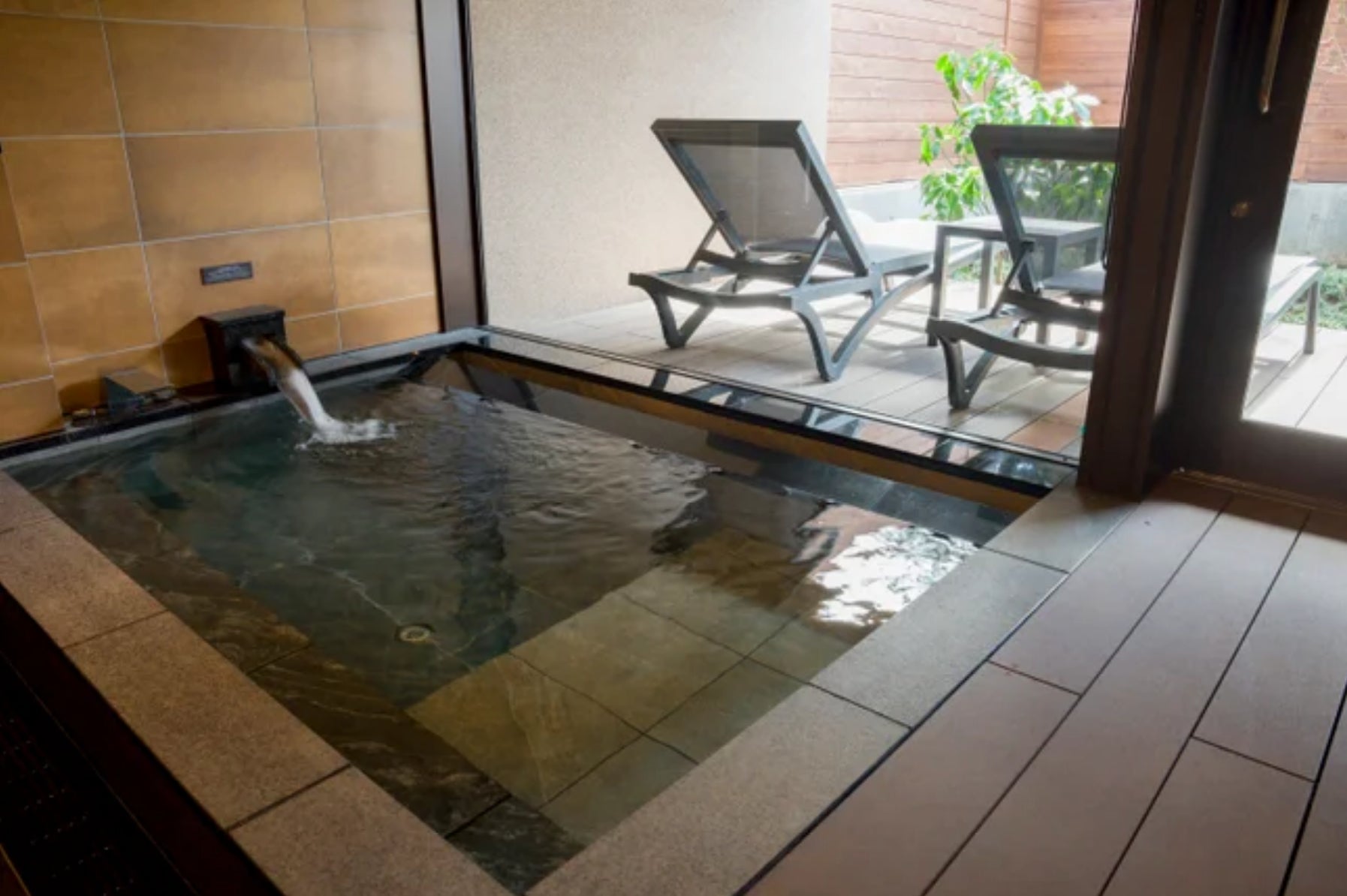 地下のワンフロアには、広さ約23㎡を有する温浴空間を展開。大人3名がゆったり入れる大きな浴槽の天然温泉、マグマスパ式サウナと水風呂、自然を感じられる外気浴デッキや、ゆったりと寛げる内気浴スペースで、ワンランク上の特別なリラクゼーション体験を演出します。