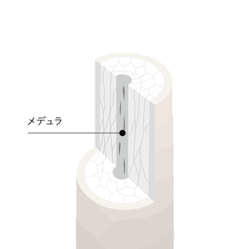 髪の見た目に大きな違いをもたらす毛髪構造の中心にあるメデュラ。このメデュラまでうるおいを届ける最新の高浸透技術(ヘアメデュラケア)を採用。ブリーチやエイジングで硬くなった髪も、毛先までしなやかに動く髪に導きます。