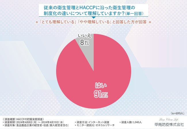 前の質問で『とても理解している』『やや理解している』と回答した方に、「従来の衛生管理とHACCPに沿った衛生管理の制度化の違いについて理解していますか?(単一回答)」と質問したところ、9割以上の方が『はい(91.9%)』と回答しました。