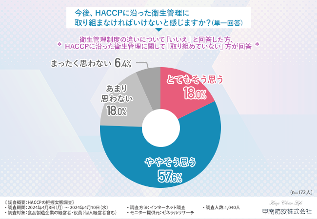 衛生管理制度の違いについて『いいえ』と回答し、HACCPに沿った衛生管理に関して取り組めていない方に、「今後、HACCPに沿った衛生管理に取り組まなければいけないと感じますか?(単一回答)」と質問したところ、7割以上の方が『とてもそう思う(18.0%)』『ややそう思う(57.6%)』と回答しました。