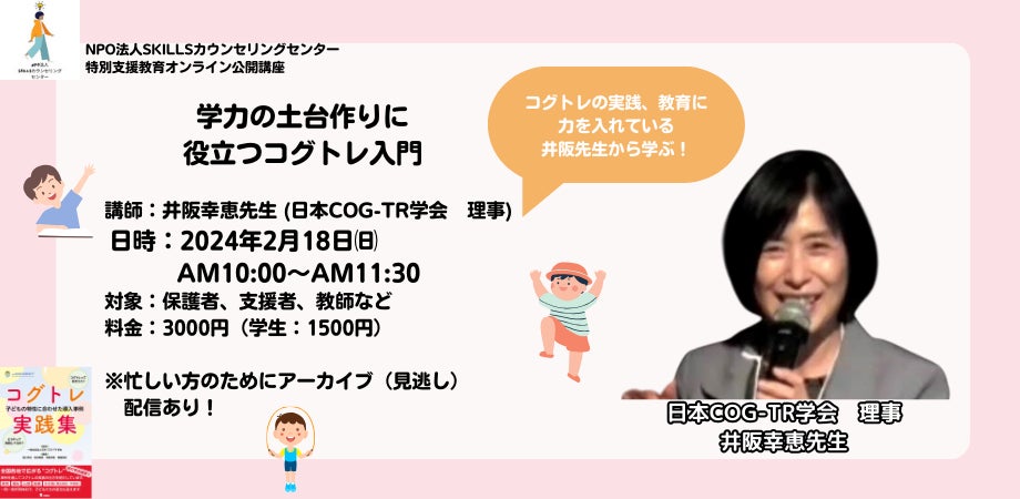 今回の講座では教育現場で長年コグトレの実践をしてきた日本COG-TR学会理事の井阪幸恵先生をお迎えし、学力が低い子どもに役立つコグトレを学び、子どもの「できた」、「やったー」が増えるようコグトレを実際に使う際のコツを学びましょう!