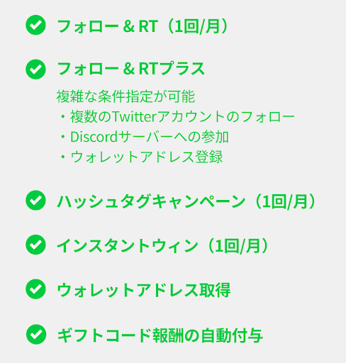 フォロー&リツイートキャンペーン・インスタントウィンキャンペーンの条件に「ウォレット登録」を設定できるようになりました。ユーザーが任意のウォレットを登録することに加え、MetaMaskとの連携によるウォレットアドレスの取得も可能です。