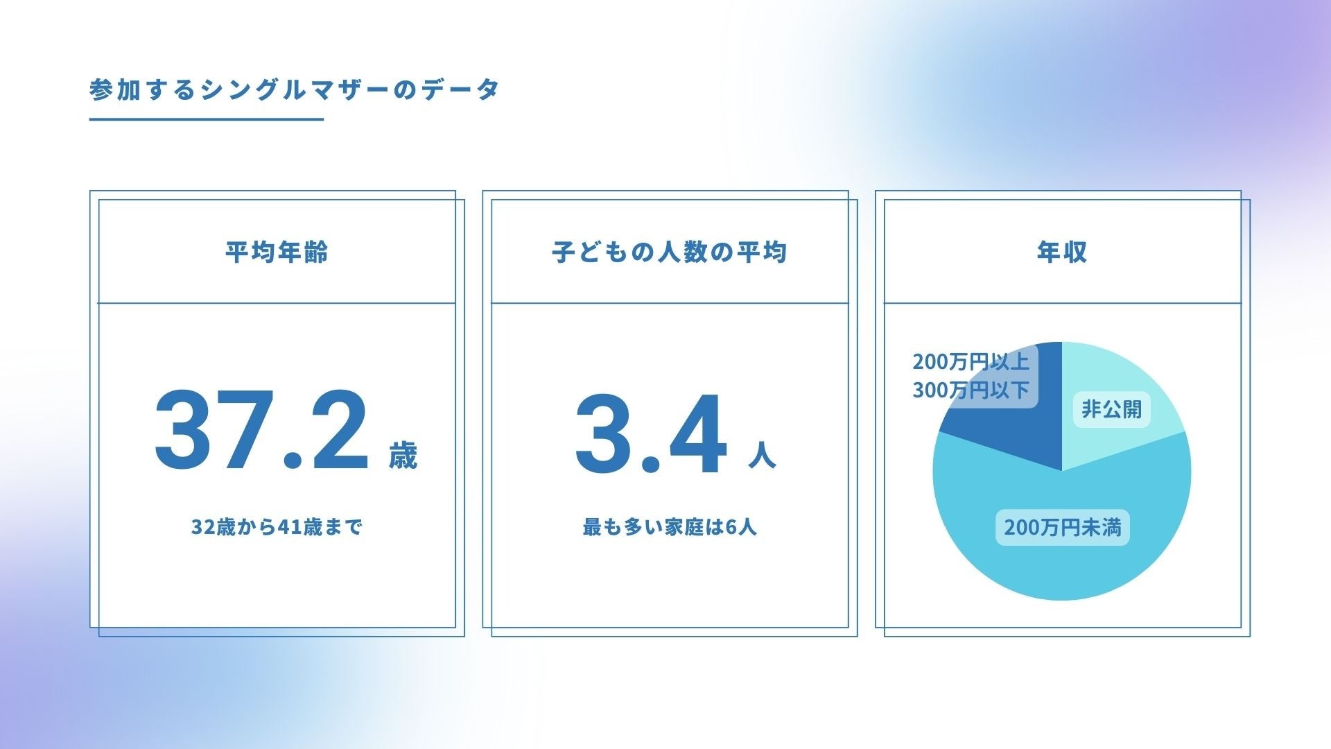 この度のシングルマザー支援プロジェクトは、公募を締め切った後も無料枠に関する相談が絶えないことから、当団体では今後も不定期に支援活動を行ってまいります。
