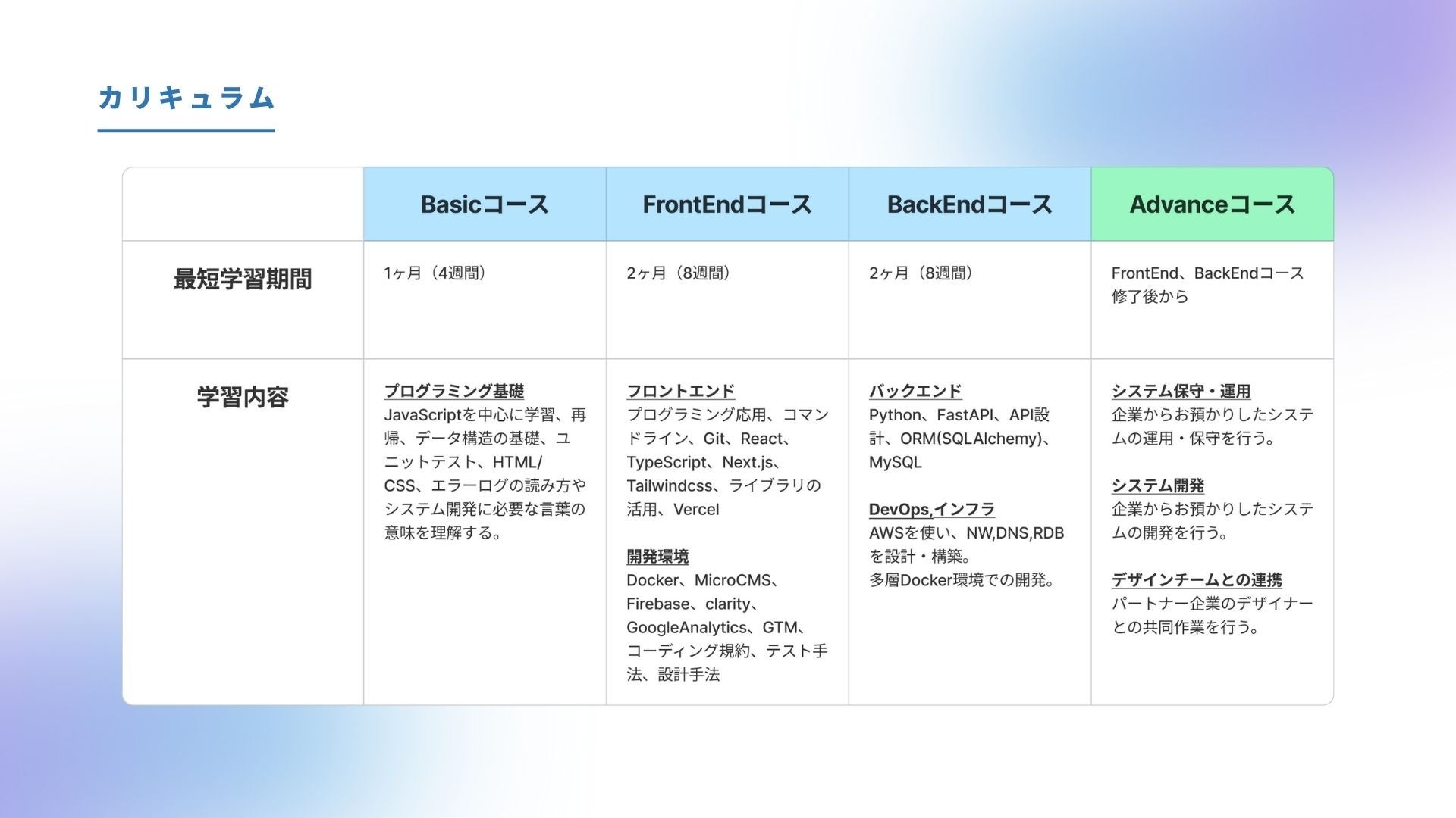 カリキュラムは育成期間と実践期間に分かれており、育成期間では個人の技術力やソフトスキルの育成を目的にプログラミングの基礎からWebサービスの構築を習得します。実践期間では、一般企業からお預かりしたシステムの開発、運用、保守業務を通して、現場経験に基づいたチーム開発力、実践力の習得を目指します。
